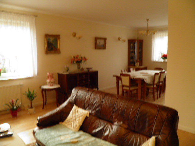 Składa się z wyodrębnionej kuchni , która łączy się z jadalnią oraz salonem.Całość zajmuje pow. ok. 44m2.W kuchni zabudowa kuchenna wykonana na wymiar z litego drzewa , która pozostaje w cenie mieszkania , w salonie kominek i z salonu jest wyjście na duży taras.Na podłodze położona deska szwedzka, która nadaje się do cyklinowania.Korytarz jest przestronny , pokoje o pow.16,15 i 10m2.Dom posiada przestronną łazienkę z oknem-łazienka jest w nowej glazurze i terakocie z wanną , bidetem oraz dodatkowo osobne wc , także wykończone w nowej glazurze i terakocie.Dodatkowym bardzo funkcjonalnym pomieszczeniem jest garderoba o pow. ok.5m2 oraz pomieszczenie gospodarcze.W całym domu na ścianach położona jest gładź i ściany pomalowane są w pastelowe kolory, drzwi wew. wykonane z litego drzewa,okna dźwiękoszczelne i kuloodporne-cały dom jest bardzo solidnie wykończony.