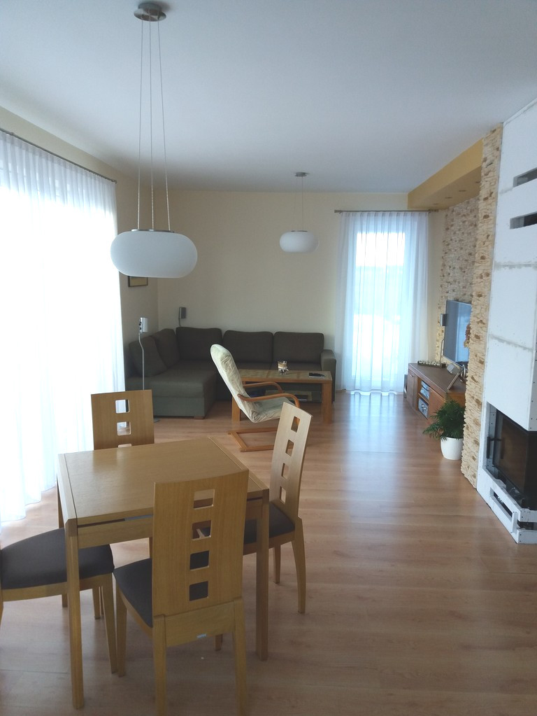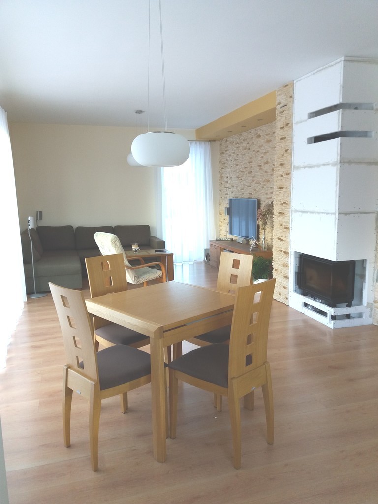 Parter- wiatrołap, przestronny hol o powierzchni ponad 15m2, pralnia, łazienka, salon z kominkiem i otwartą kuchnią o łącznej powierzchni ponad 30m2 z wyjściem na taras, oraz dwa pokoje gościnne o pow. 11m2 każdy.