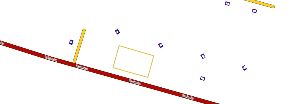 Działki o powierzchniach po ok. 1000 m2 w kształcie prostokąta o dłuższym boku przyległym do drogi krajowej DK10.