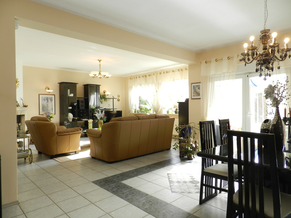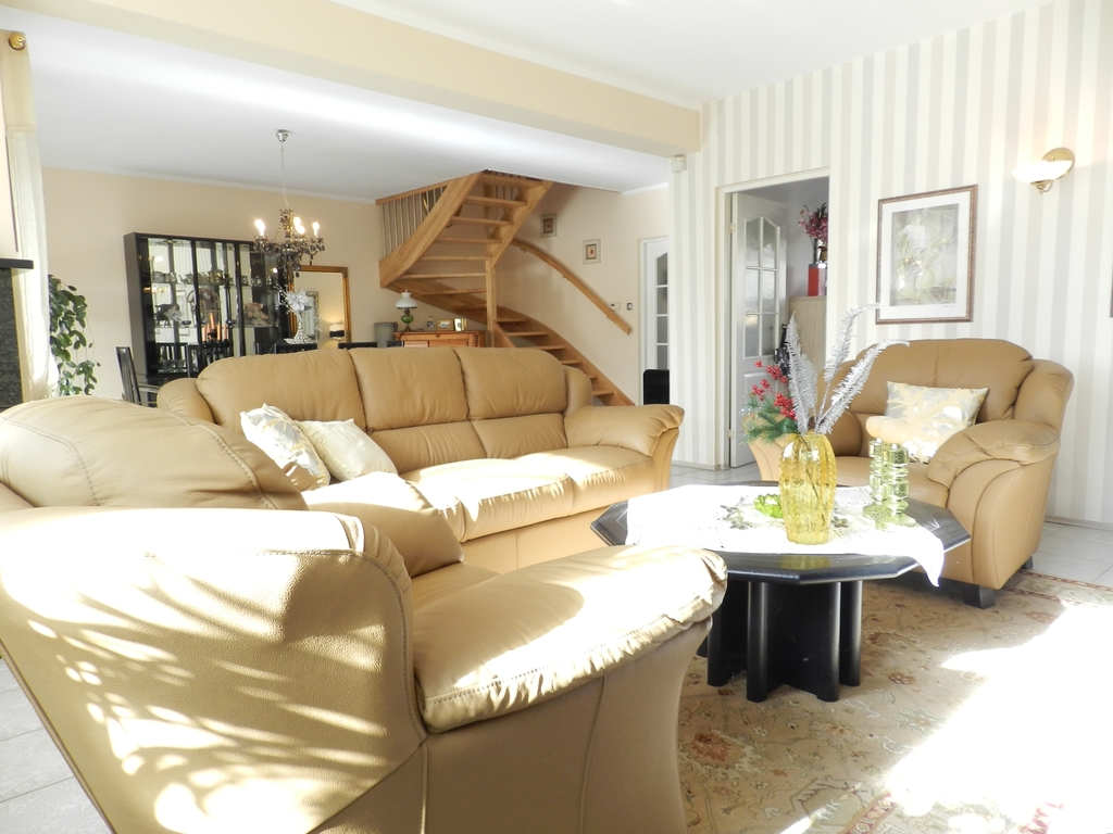 pokoju dziennego z kominkiem połączonego z jadalnią (łączna powierzchnia ok. 42 m2) z wyjściem do ogródka zimowego a z niego do ogródku, kuchni i łazienki z kabiną prysznicową. Garaż oraz kotłownia/pomieszczenie gospodarcze.
