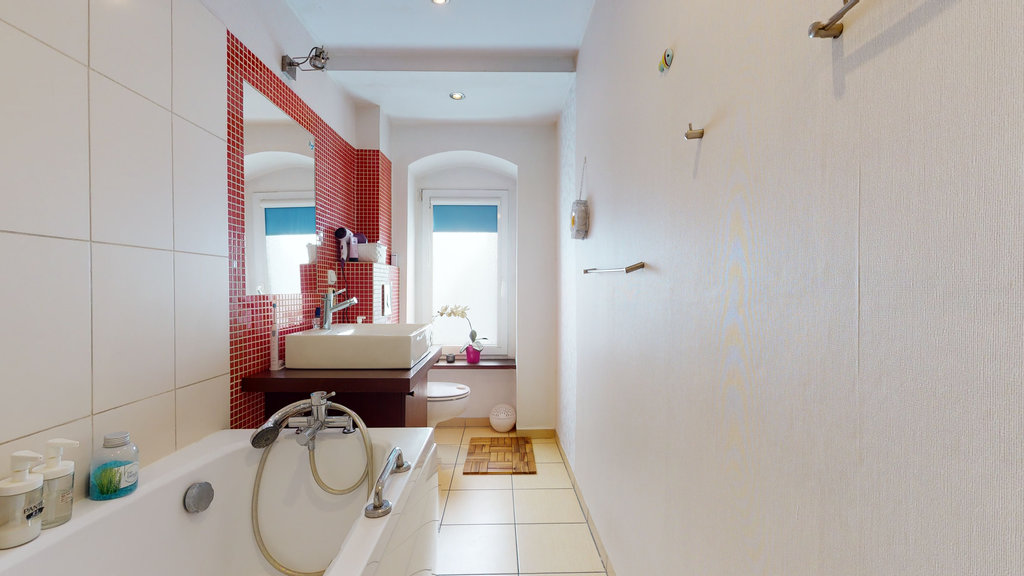 - łazienka - po generalnym remoncie, z dużym oknem, położona odrobinę ponad poziomem całego mieszkania, dlatego wchodzimy do niej po oryginalnych drewnianych schodach.