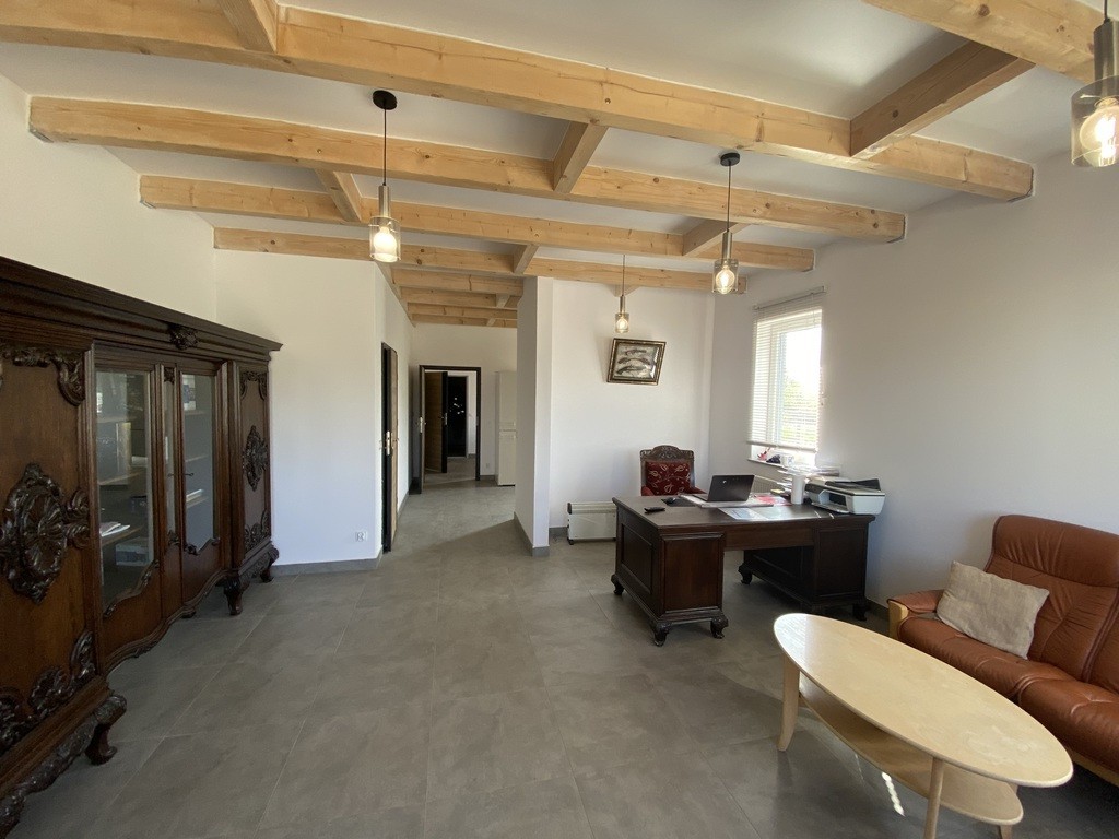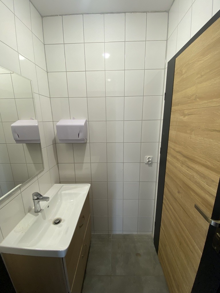 W części biurowej zaprojektowano pomieszczenie biurowe z wydzieloną jadalnią i aneksem kuchennym oraz toaletę ogólnodostępną, szatnię połączoną z wc i natryskiem. Obydwie części są ze sobą połączone komunikacyjnie. Obiekt ogrzewany jest gazem, w hali nagrzewnice. Standard obiektu wysoki - foto.