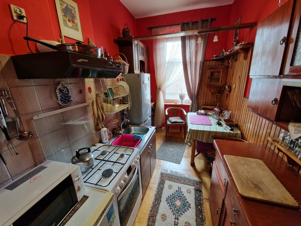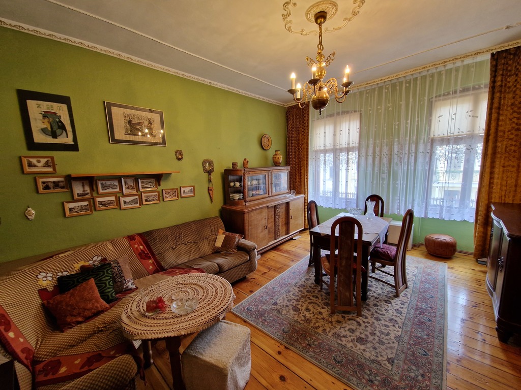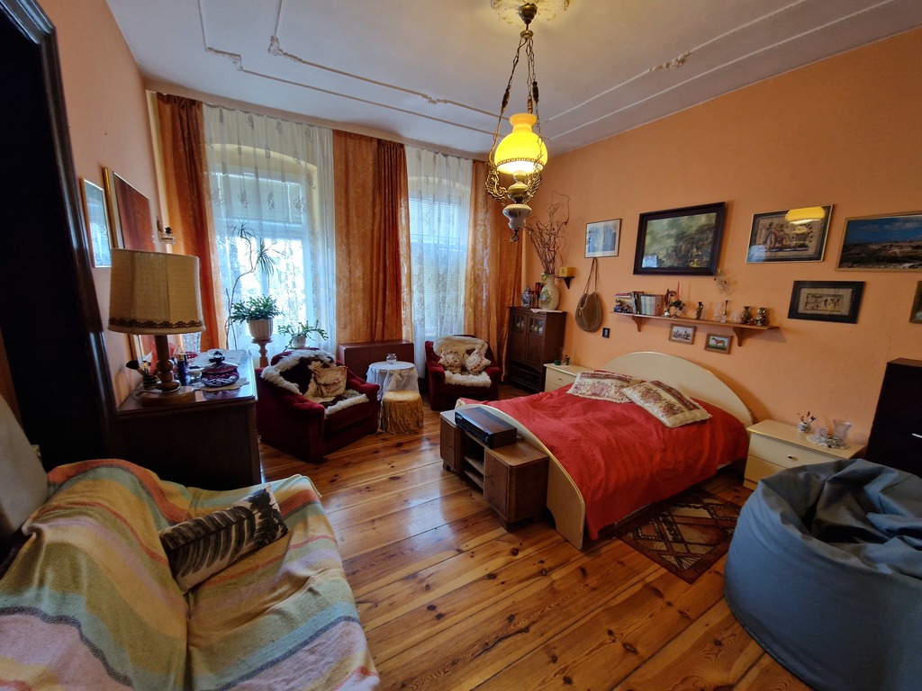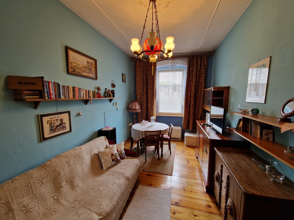 Mieszkanie składa się z 3 pokoi i znajduje się na trzecim piętrze. Na powierzchnię 90,69m2 składają się : dwa pokoje o pow. 24,36m2 i 24,41m2, które mają okna od frontu oraz trzeci pokój (17,64m2), kuchnia (8,82m2) i łazienka (6,75m2), które mają okna od podwórza. Całość połączona jest przedpokojem (7,62m2) z którego wejdziemy do każdego pomieszczenia (mieszkanie rozkładowe). Drzwi wejściowe do mieszkania zachowane oryginalne poniemieckie, podłogi w pokojach i korytarzu to również deska niemiecka w dobrym stanie. W pokojach zachowane są również sztukaterie co jest coraz rzadsze. Mieszkanie ma olbrzymi potencjał .