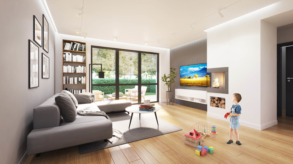 - Wygodny salon z przeszkleniami i bezpośrednim wyjściem na ogród, połączony z otwartą kuchnią i jadalnią.