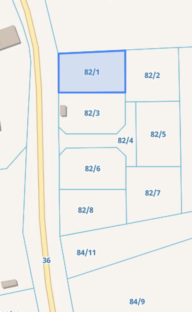 Działka 82/1, pow. 875 m2, wjazd na działkę z drogi asfaltowej.