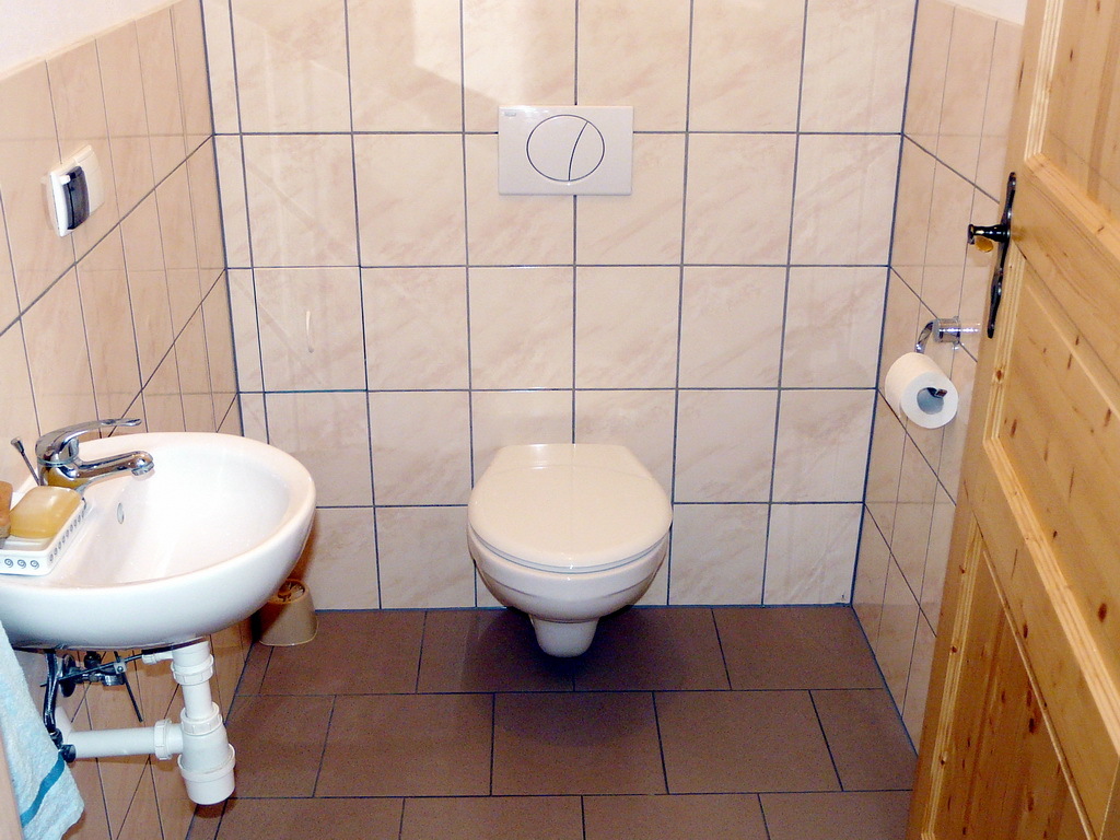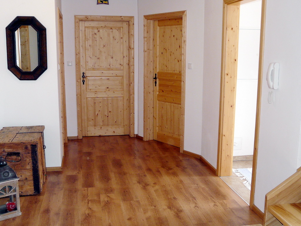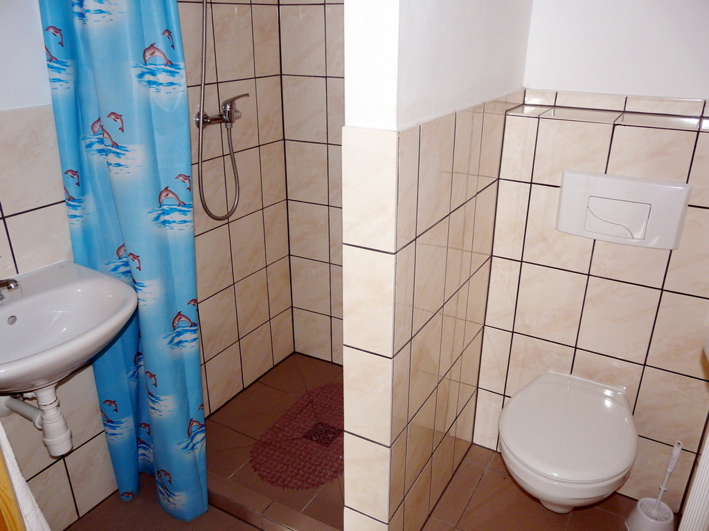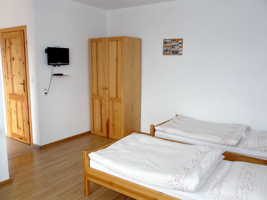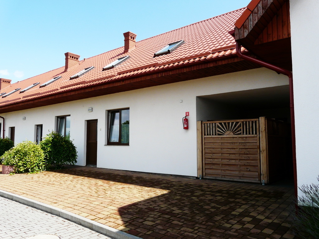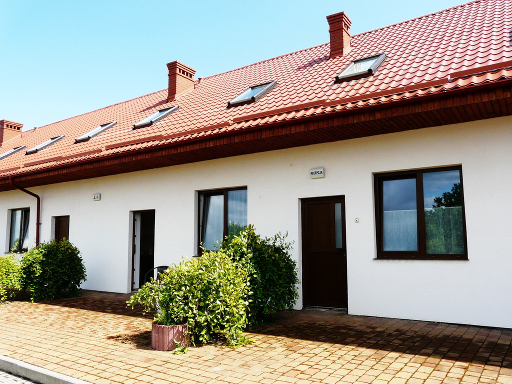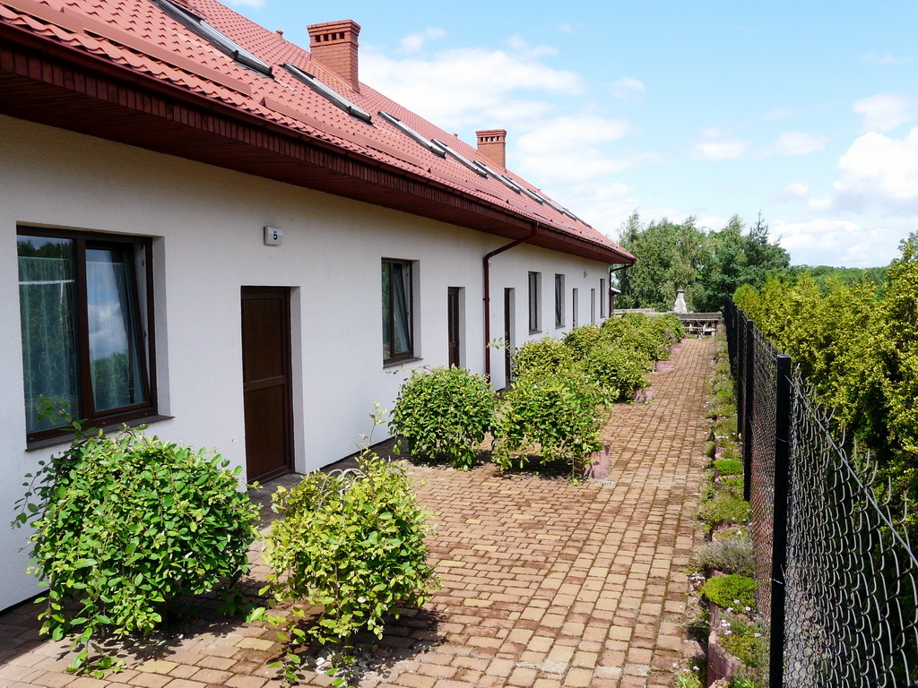 Na parterze znajduje się 9 w pełni umeblowanych i wyposażonych pokoi z łazienkami (tv, kuchnia, lodówka, meble) w tym jeden pokój przystosowany dla niepełnosprawnych oraz pomieszczenie recepcji i kotłownia. Do każdego pokoju niezależne wejście z dworu a przed każdym pokojem wydzielony osobno drzewkami, utwardzony polbrukiem taras.