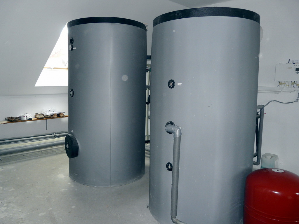 ciepła woda – zbiorniki 1 000 L i 800 L zasilane z systemu z solarami,