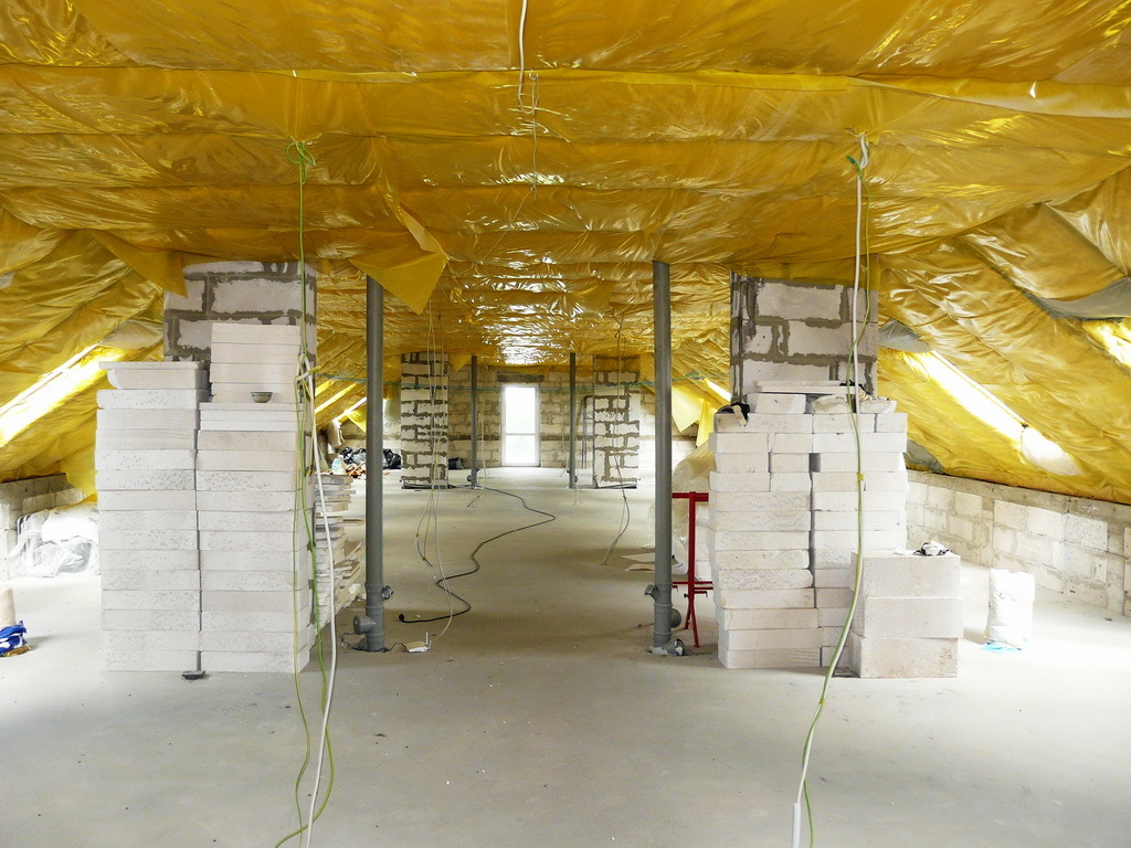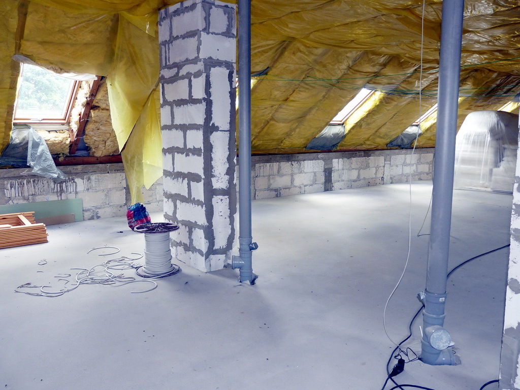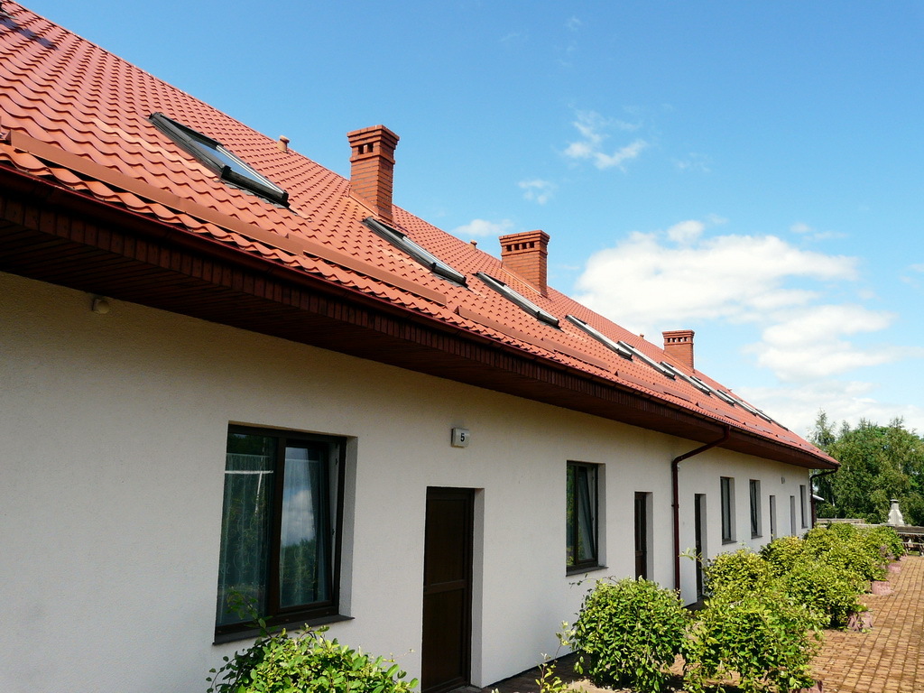 Dach budynku kryty dachówką ceramiczną z izolacją (20 cm wełny).