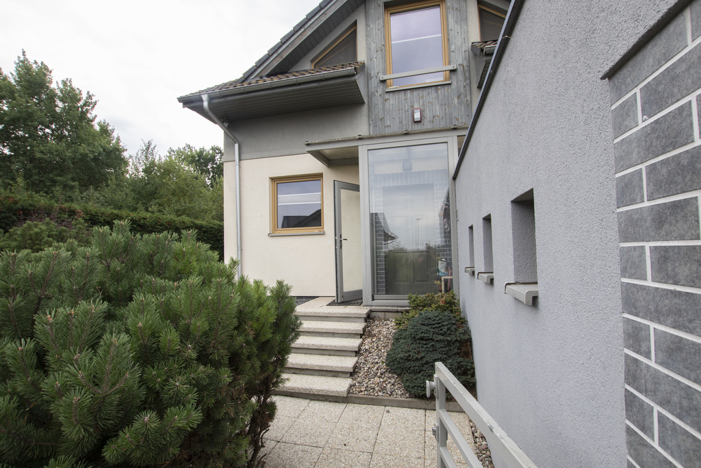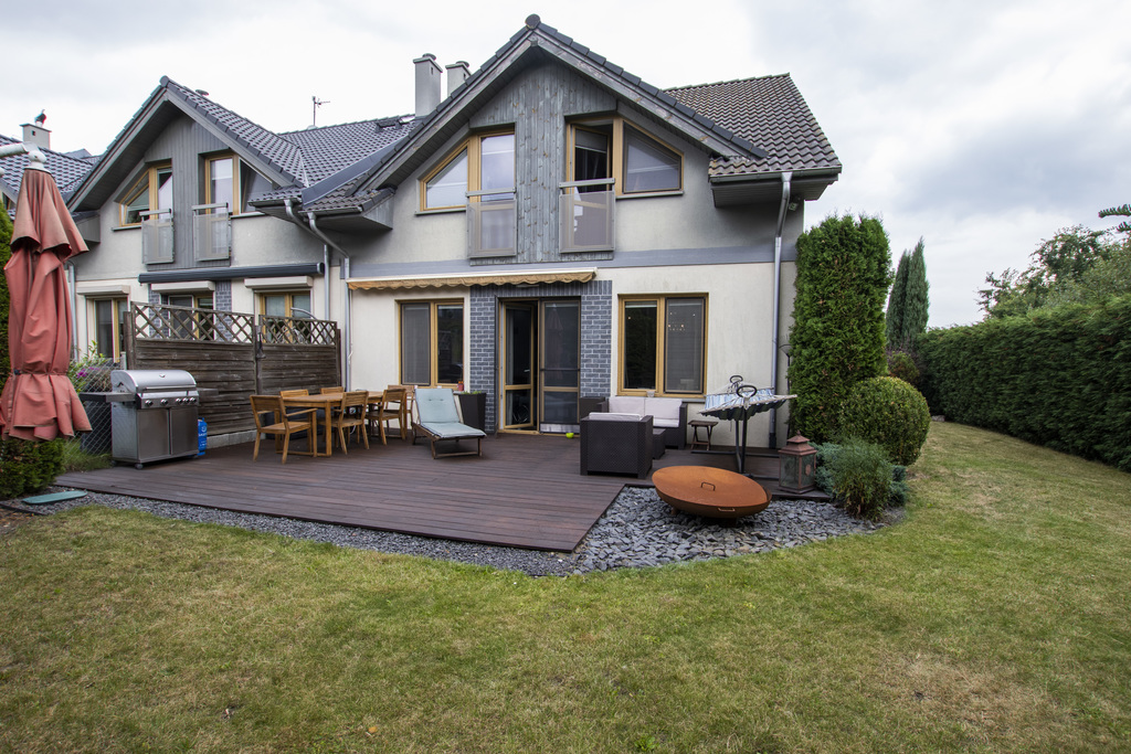 Na sprzedaż skrajny szeregowiec w dzielnicy Bukowo. Dom dwukondygnacyjny o powierzchni 146,3 m2, pięknie położony, na końcu spokojnej uliczki z jednej strony otoczony drzewami. Ogród pięknie zagospodarowany, dodatkowo (oprócz terenu działki na której posadowiona jest nieruchomość) około 200 m2 powierzchni dzierżawionej od miasta. Na parterze znajduje się przestronny salon z wyjściem na duży taras i do ogrodu. Salon połączony jest z aneksem kuchennym umeblowanym i wyposażonym w wysokim standardzie. Znajduje się tu także gabinet, łazienka dla gości, duże pomieszczenie gospodarcze pełniące funkcję spiżarni, pralni i kotłowni oraz wiatrołap. Na piętrze jest duża sypialnia z łazienką i garderobą, dwie mniejsze sypialnie i łazienka. Całość urządzona nowocześnie i komfortowo. Garaż w bryle budynku.