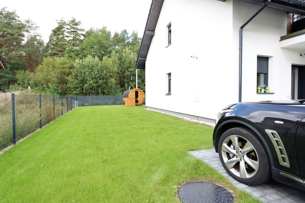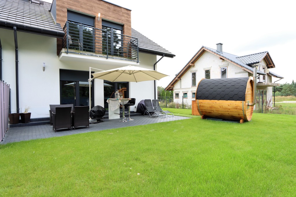 W ogrodzie trawa z rolki, dodatkowo znajduje się sauna wolnostojąca.