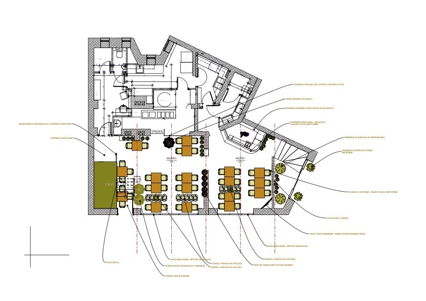 Powierzchnia lokalu to 140 m2. Podzielony jest na salę główną wraz z barem z 45 miejscami dla gości oraz zaplecze zajmujące około 65 m2.