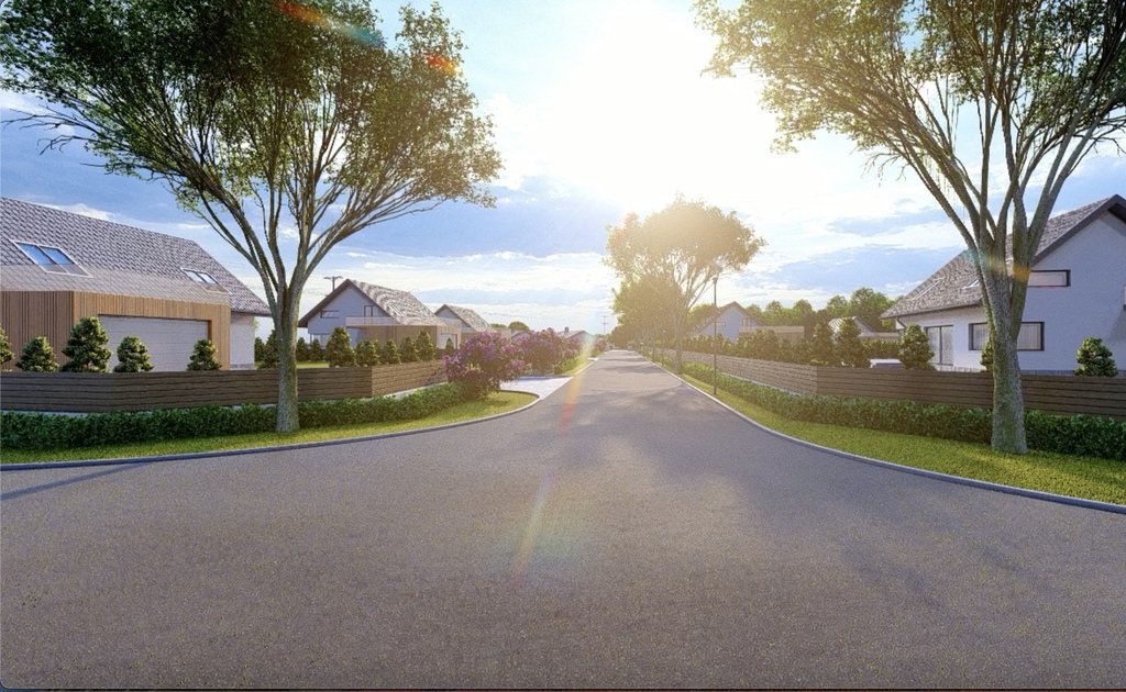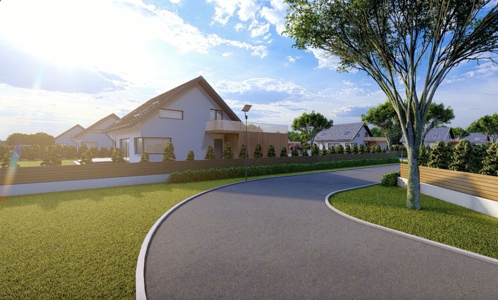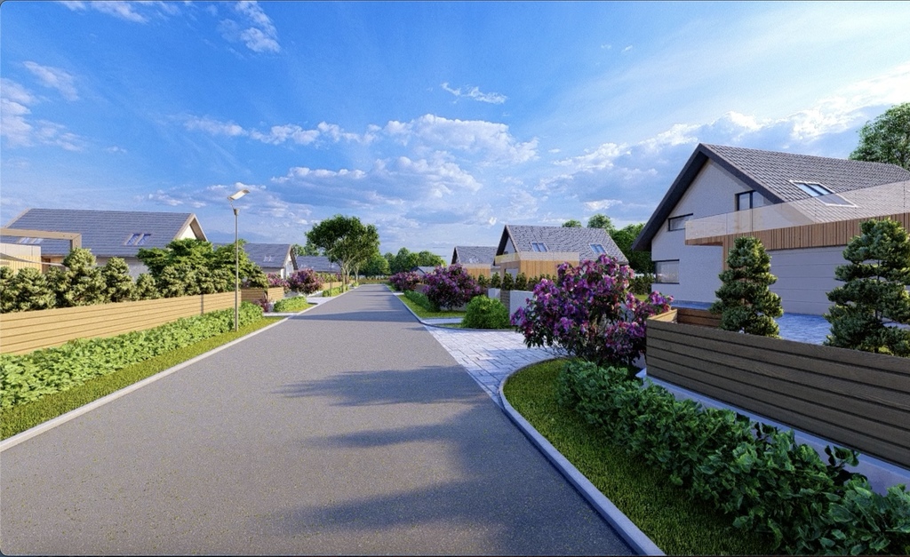 Otoczenie nowej zabudowy jednorodzinnej w spokojnej miejscowości.