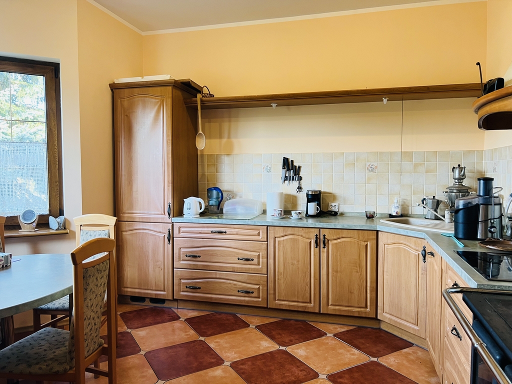 Duża jasna kuchnia z przecudnym widokiem na jezioro.