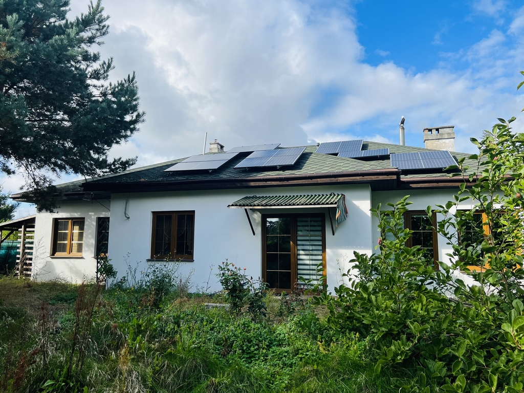 Dach pokryty gontem, z zamontowaną instalacją fotowoltaiczną o mocy 3,4 kW.