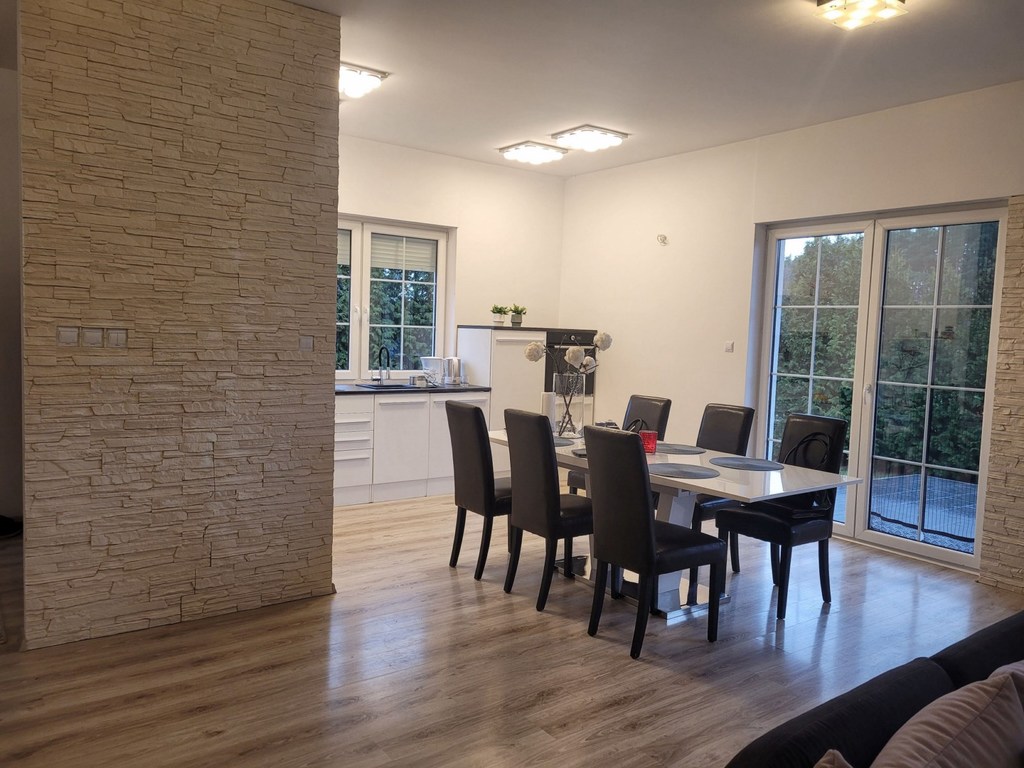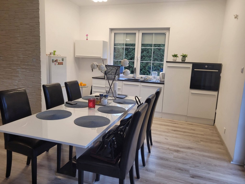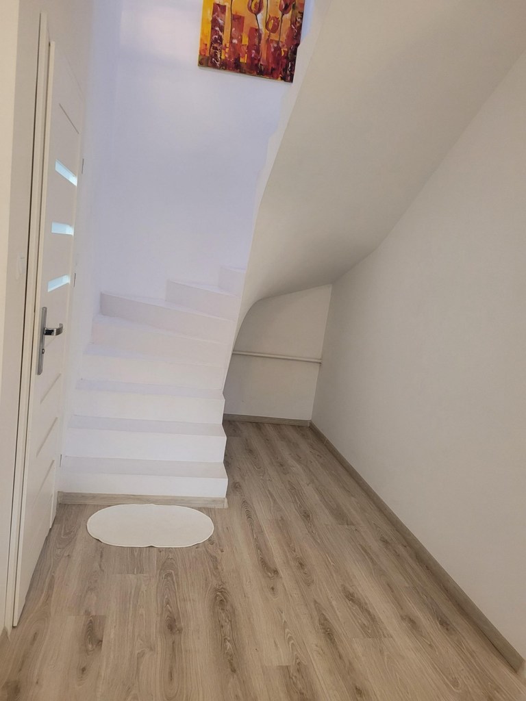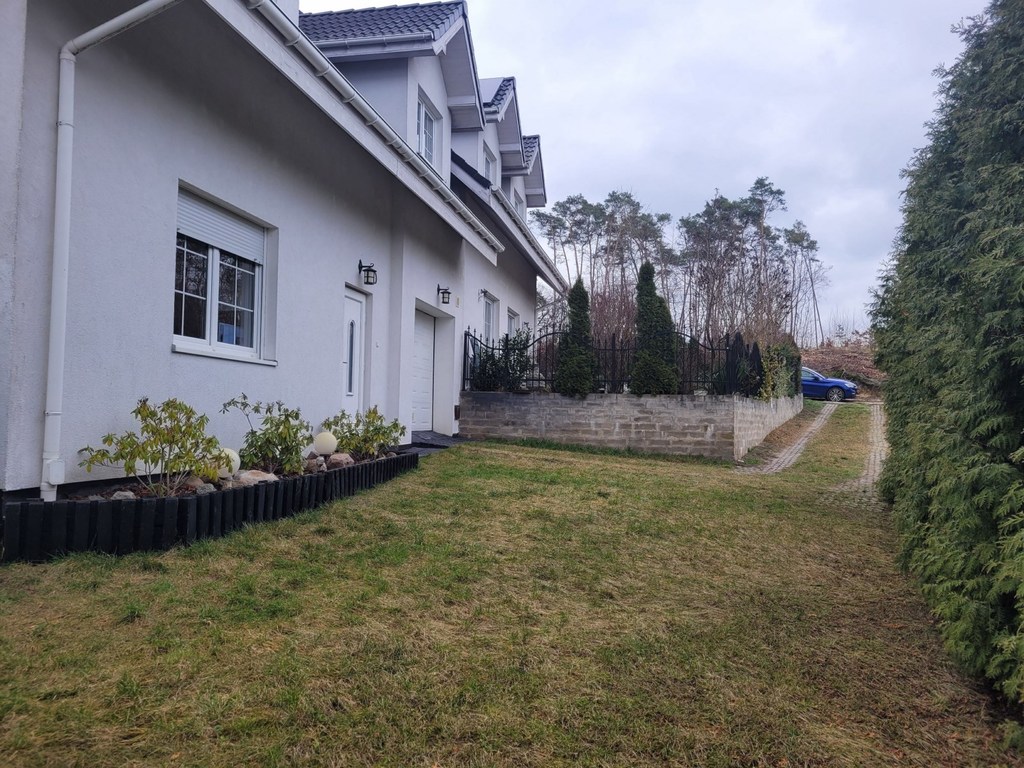 Pilchowo - nowa 1/2 bliźniaka zlokalizowanego w wyjątkowo urokliwym miejscu - wokół las ,łąki, cisza i obcowanie z przyrodą. Dom wybudowany z cegły, ocieplony styropianem 12 cm, jasna elewacja, dach z lukarnami pokryty dachówką Brass. Dom jest nowy, ma odbiór budowlany z listopada 2021 roku. Garaż 16 m2 w bryle budynku. Dom nie jest podpiwniczony, ale posiada strych o powierzchni 35 m2 do dowolnej aranżacji. Dom ma 2 kondygnacje po 100 m2 po podłodze na każdej z kondygnacji. Parter domu to duży salon o powierzchni około 70 m2 otwarty na widną kuchnię i z wyjściem na taras. Kuchnia z nowymi meblami kuchennymi i sprzętem AGD /płyta grzewcza elektryczna, piekarnik elektryczny, zmywarka/. Podłoga pokryta panelami, cały parter ma ogrzewanie podłogowe, na piętrze grzejniki. W łazience na parterze zamontowano piec gazowy dwufunkcyjny. Schody na piętro wylewane. Na piętrze 3 duże sypialnie z niewielkimi skosami o powierzchni 26, 26 i 28 m2. Największa sypialnia z balkonem. Łazienka z niewielkim skosem o po. 10 m2 z dużą kabiną, wc i umywalką /miejsce na montaż wanny/. Łazienka wykończona glazurą i terakotą. Woda gminna, kanalizacja miejska. Nieruchomość ogrodzona, działka zagospodarowana obsadzona tujami stanowi cichy urokliwy zakątek. Idealne miejsce do zamieszkania i wypoczynku. Polecam.