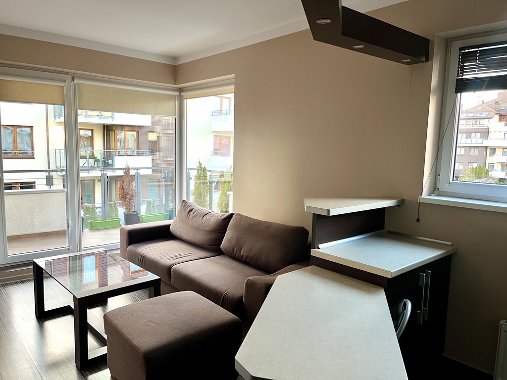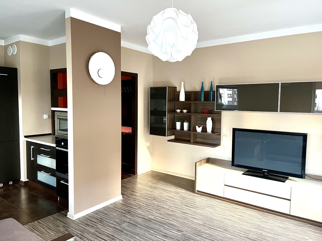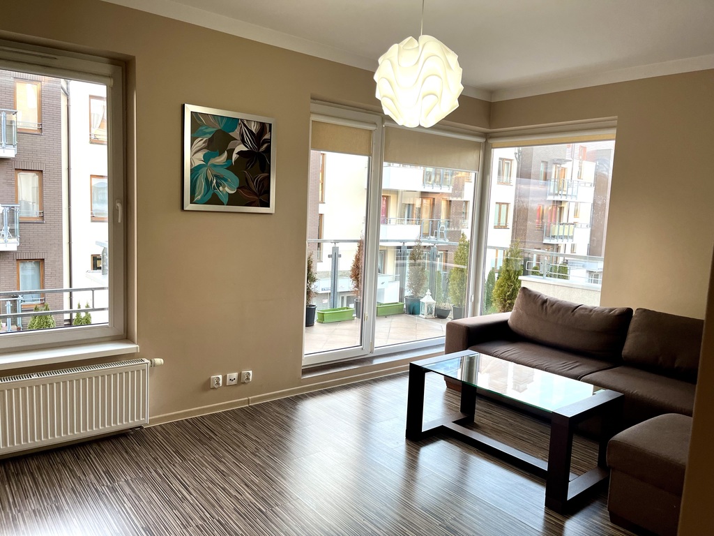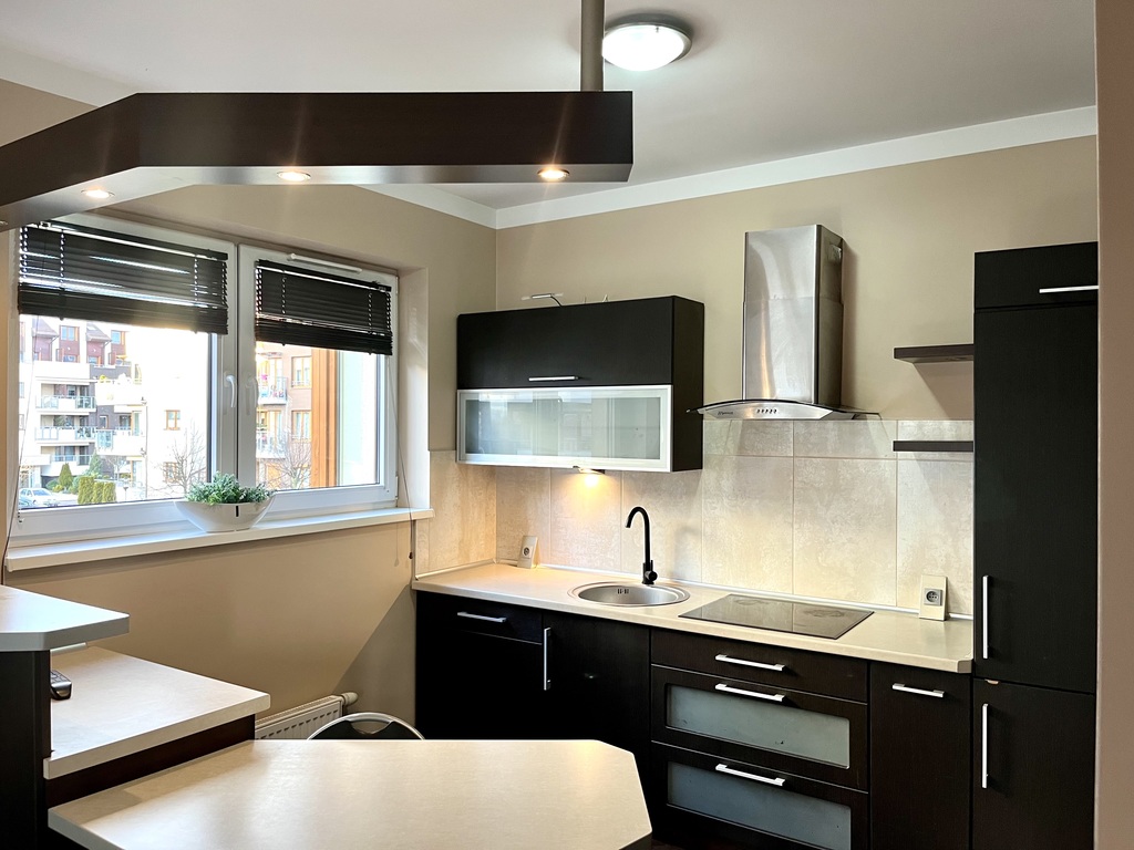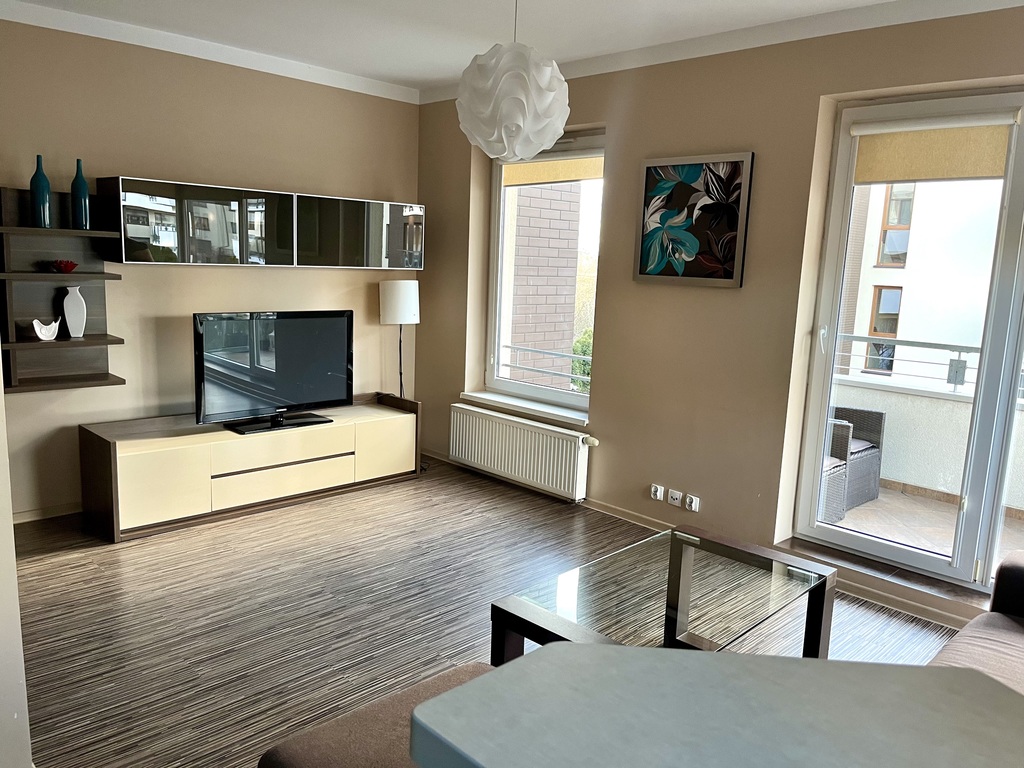 Mieszkanie posiada kuchnię otwarta na salon, sypialnię, łazienkę z z kabiną prysznicową, przedpokój oraz duży balkon (ok. 9m2) Do mieszkania przynależy komórka lokatorska (1,9m2). Mieszkanie jest kompletnie urządzone i umeblowane jak na załączonej fotogalerii, gotowe do zamieszkania. Na mieszkanie przypadają dwie karty dostępu do zewnętrznych miejsc postojowych (nieprzypisane) dzięki czemu dostępność parkingu jest wystarczająca.