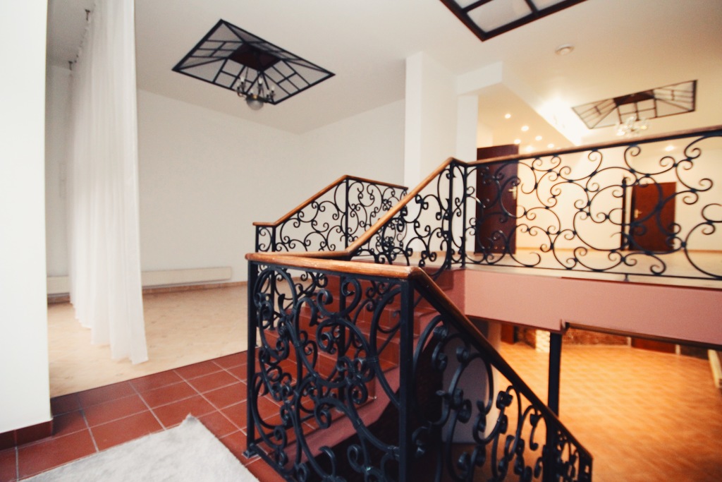 wejście równo z ulicą, przestrzeń przechodząca w duże schody prowadzące na podwyższony parter oraz w dół