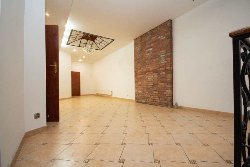 to klimatyczna duża przestrzeń udekorowana cegłą na ścianach, na tym poziomie znajduję się również łazienka z wejściem do toalet oraz pomieszczenie gospodarcze