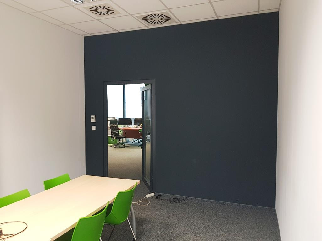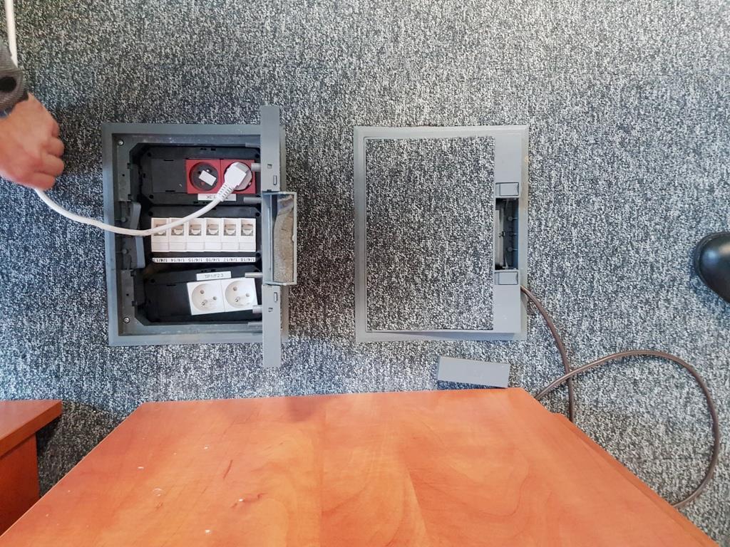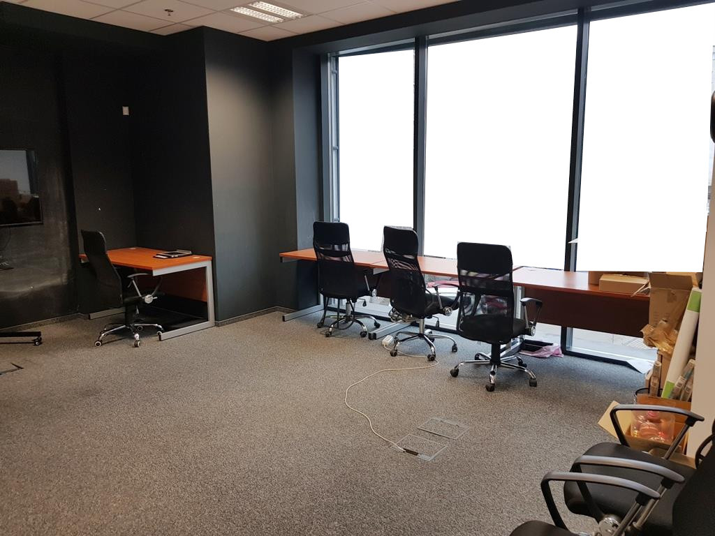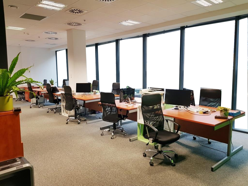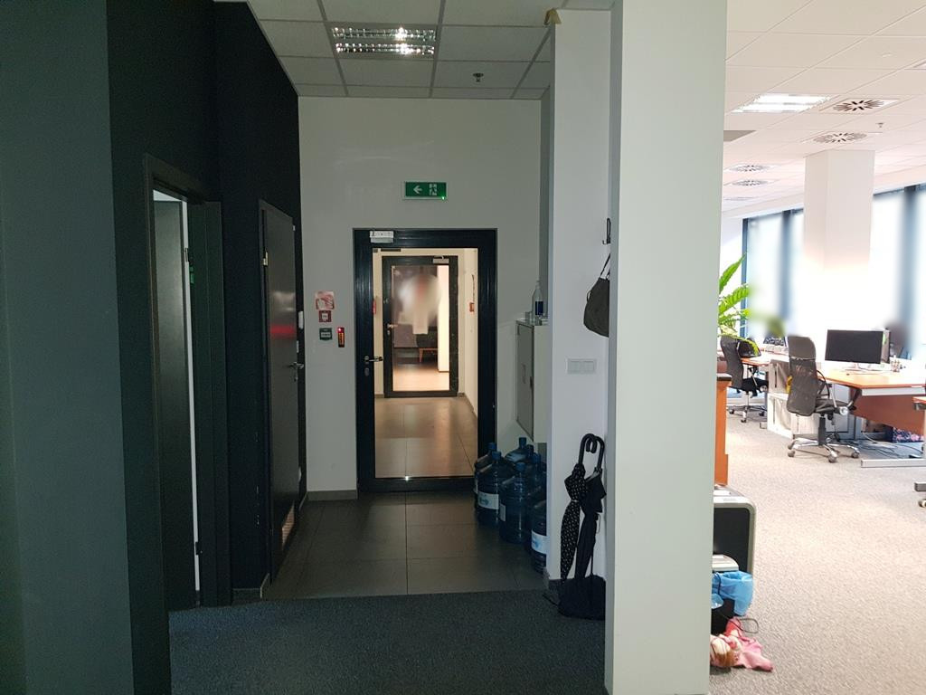 Na podłogach biura wykładzina przemysłowa (pod spodem podniesiona tzw. podłoga techniczna z puszkami podłogowymi), sufity podwieszane z oświetleniem rastrowym.