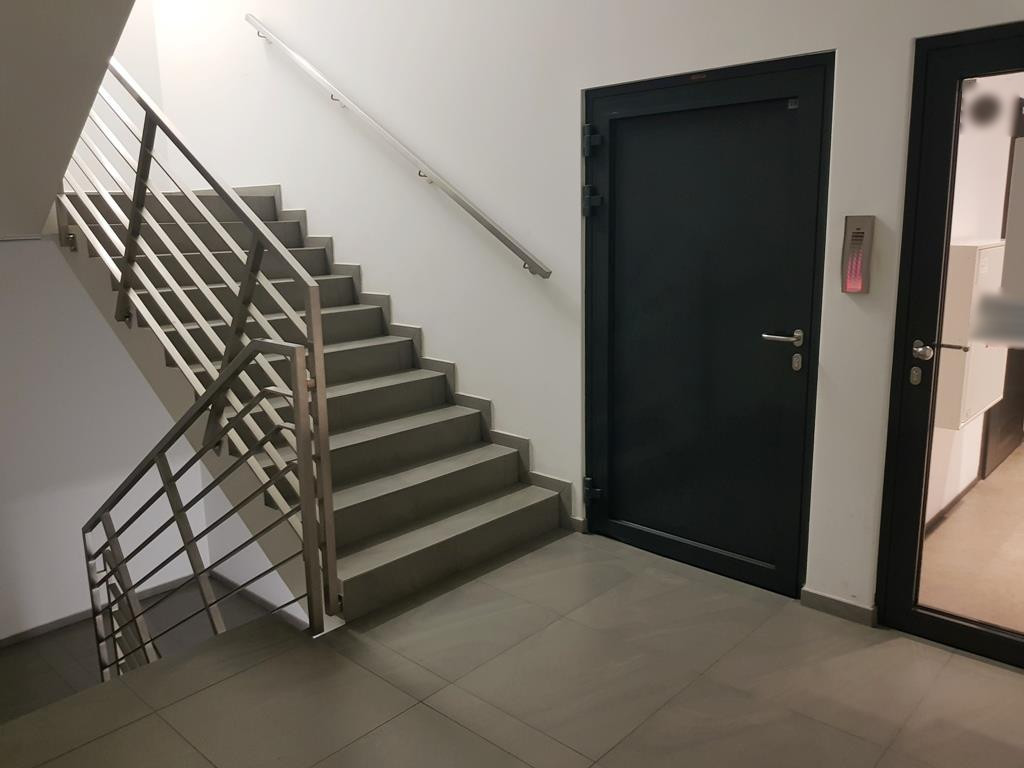 Klatka schodowa estetyczna – na podłogach kafle, ściany gładzone i malowane.