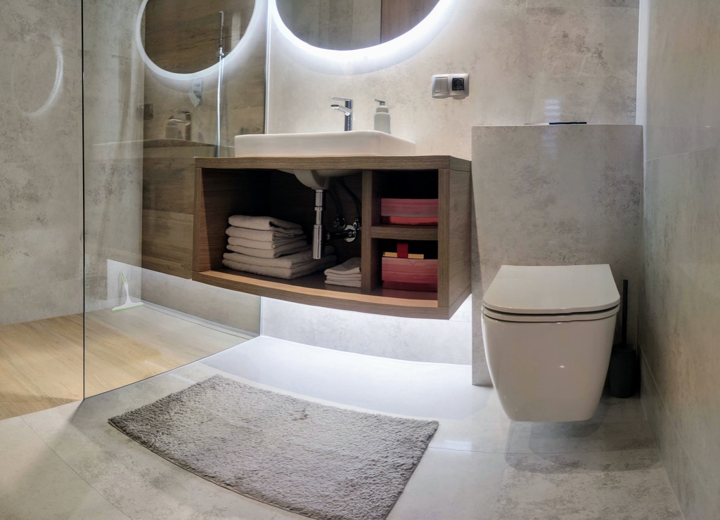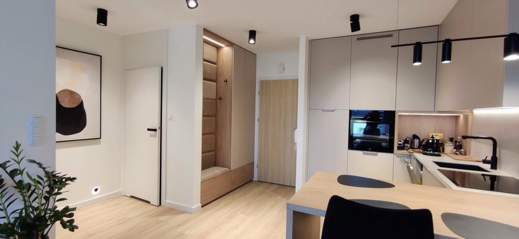 podłogi quick-step, drzwi Porta (bezprzylgowe), lampy z kolekcji Shilo, wszystkie meble na wymiar, polskich firm (bydgoskie fabryki mebli), blat kuchenny-kamienny, zlew podwieszany, sprzęt AGD firm Bosch i Electrolux, podświetlenia ledowe (karnisze, podłogi), odpływ liniowy (w łazience), baterie podtynkowe, zasłony, poduszki (szyte na miarę). Na balkonie: deska tarasowa, krzesła i stół firmy Nardi, kosz-kokon.