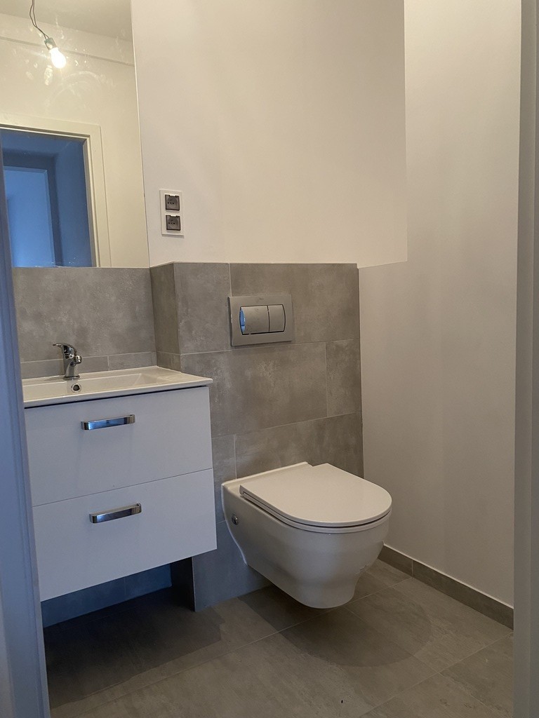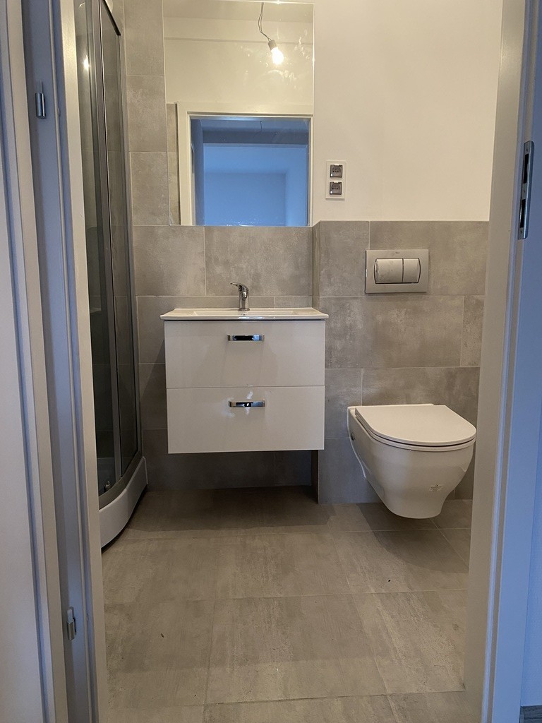 Łazienka wykończona w nowoczesnej glazurze i terakocie z kabiną prysznicową, umywalką, szafką pod umywalkę i WC.