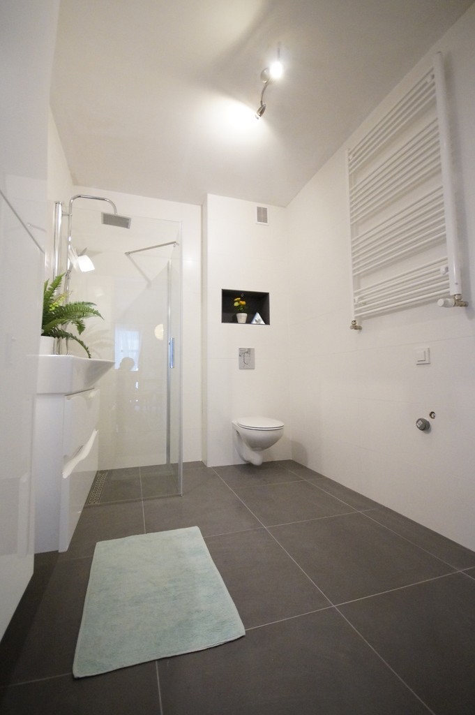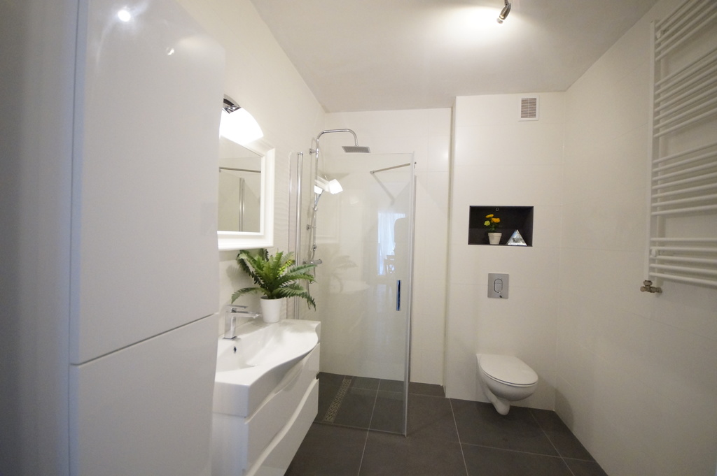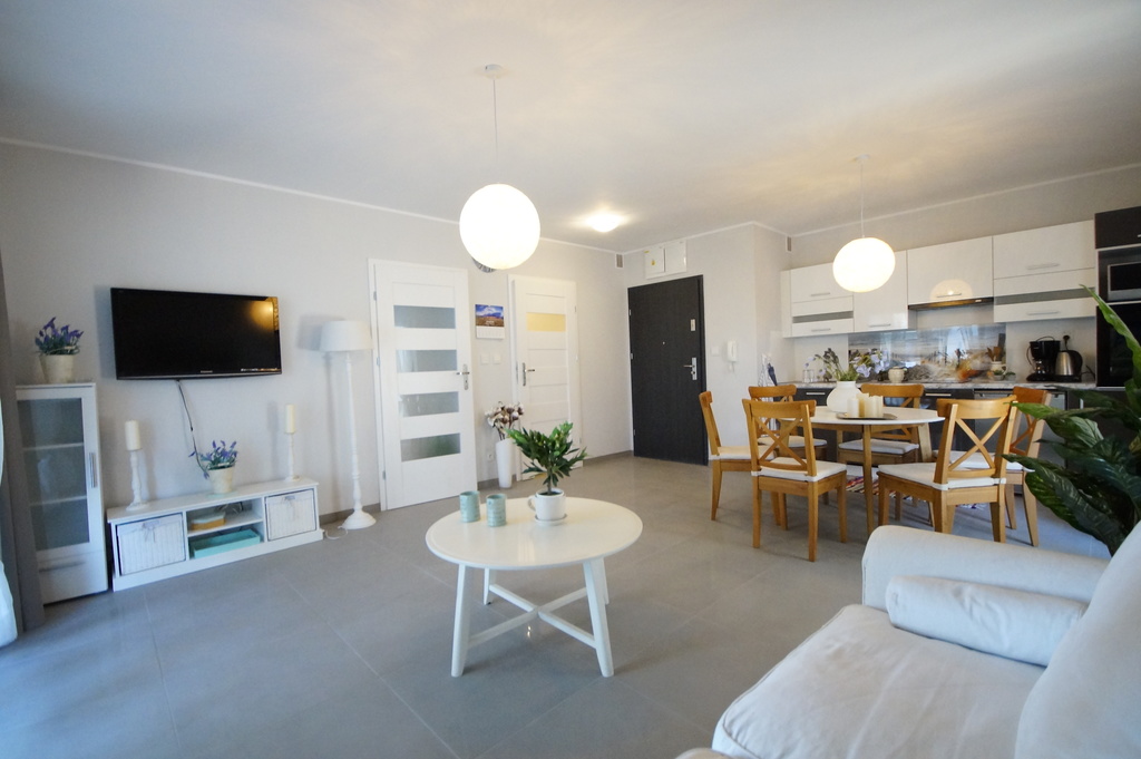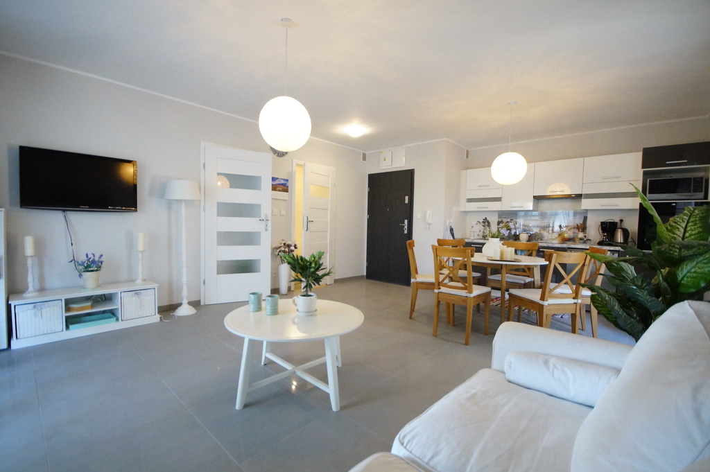 Apartament jest nowocześnie wykończony, z łazienką wyposażoną w kabinę prysznicową z odpływem liniowym wc i umywalkę oraz kompletnie wyposażonym i umeblowanym aneksem kuchennym ( meble w zabudowie, płyta kuchenna, zmywarka, lodówka) .