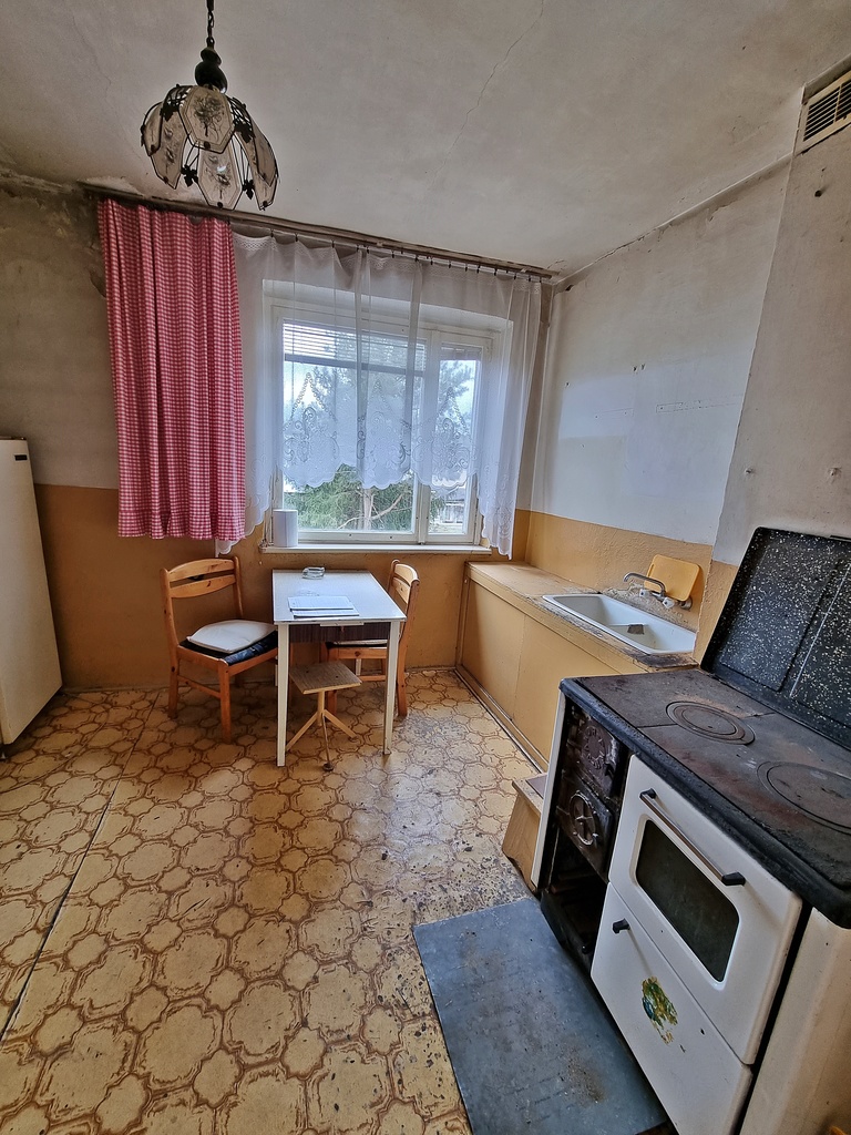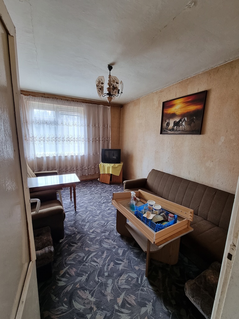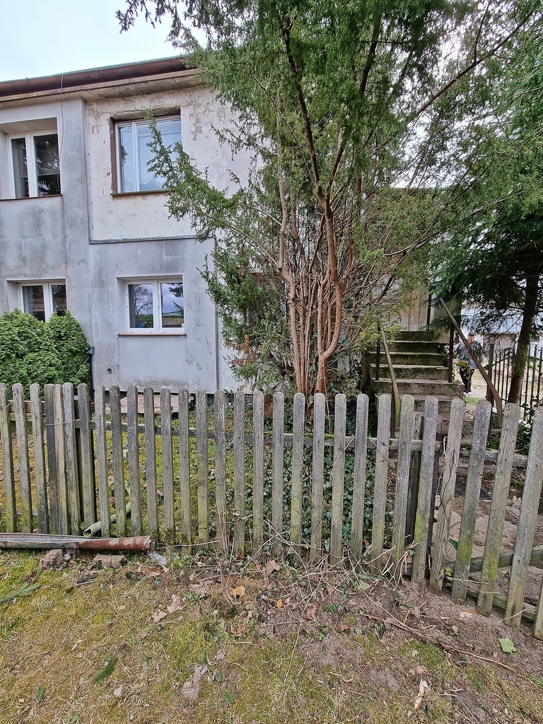 Mieszkanie bezczynszowe, do remontu. Do mieszkania przynależą dwa drewniane pomieszczenia gospodarcze oraz ogródek o metrażu 600 m2 w częściach wspólnych. Dodatkowo do nieruchomości jest sprzedawana działka o powierzchni 400 m2, oddalona od nieruchomości jakieś 100m.