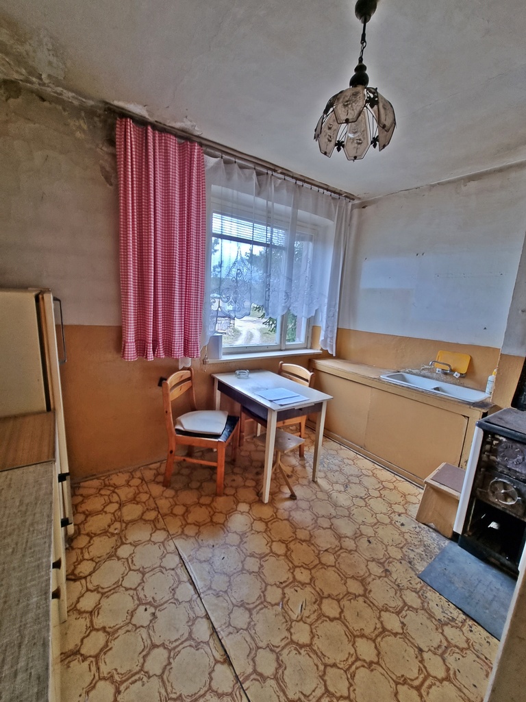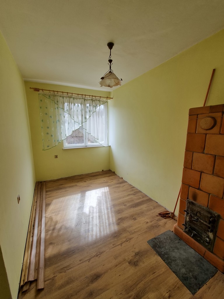 Ogrzewanie z pieców kaflowych, w kuchni kuchenka westfalka. Okna stare drewniane. Na podłodze panele, linoleum, wykładzina.