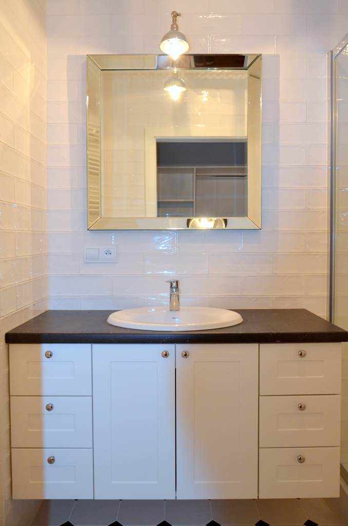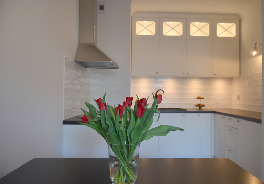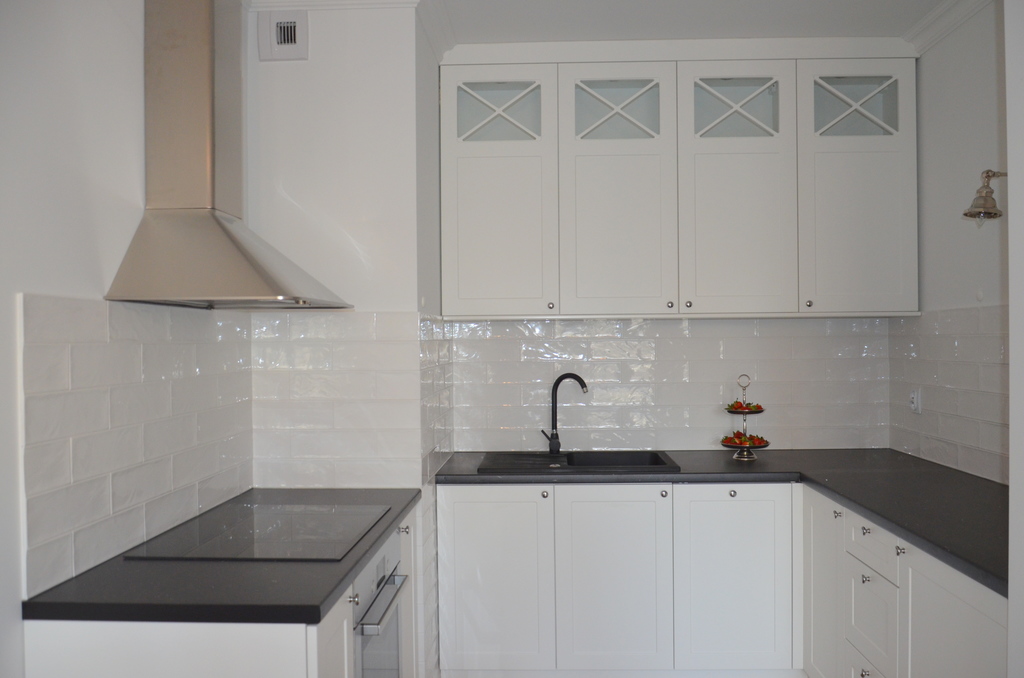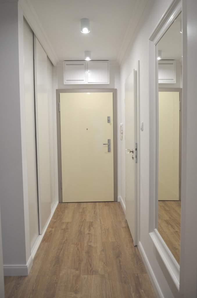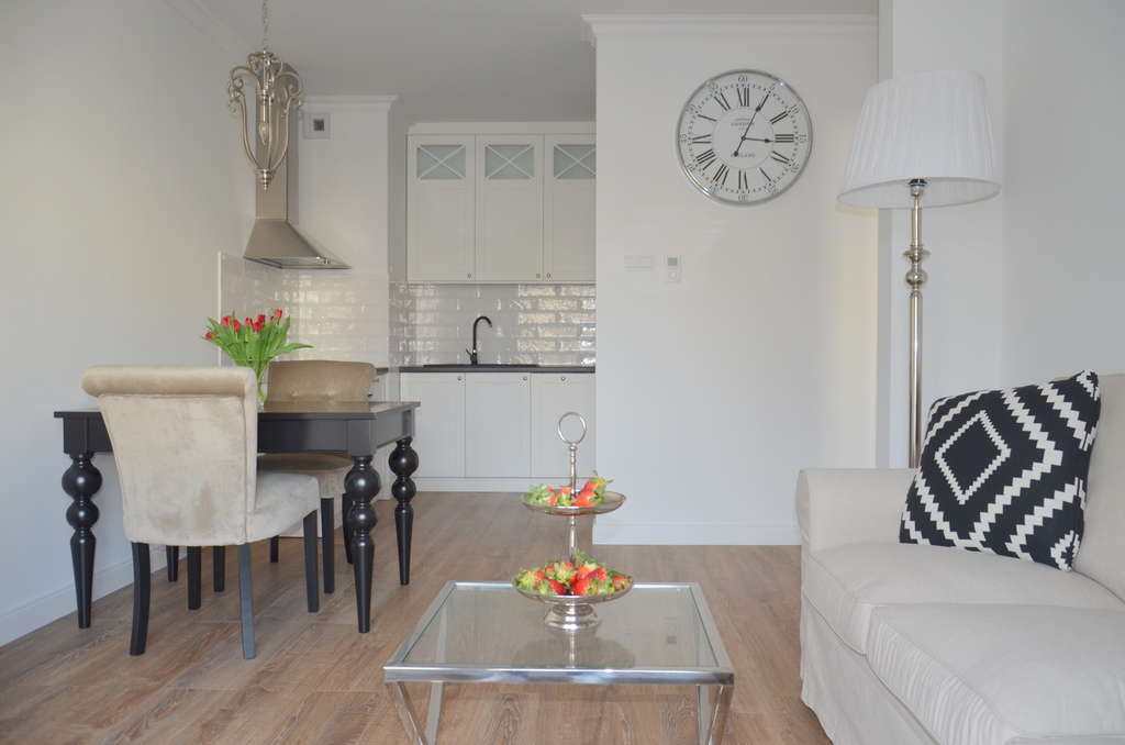 Mieszkanie wykończone w klasycznym stylu, utrzymane w białym kolorze, przełamanym czernią i beżami, co stwarza piękny, estetyczny efekt w połączeniu z meblami i pięknymi lampami.