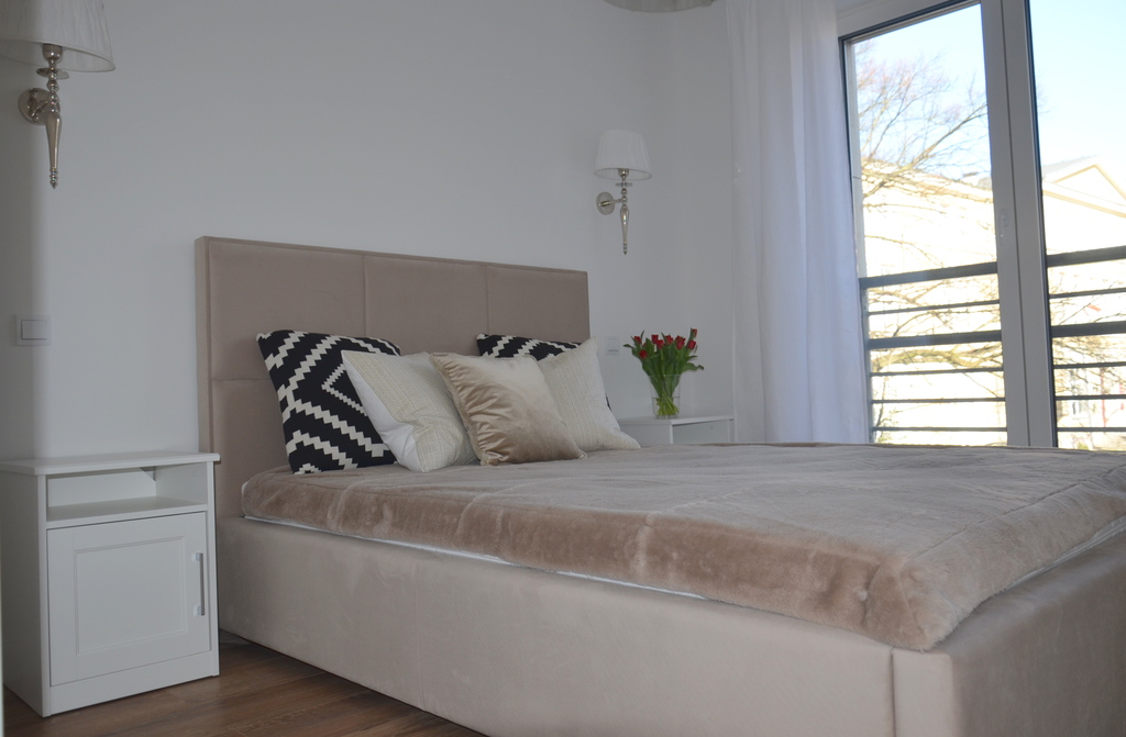 W całym apartamencie na podłogach wysokogatunkowe panele, ściany wykończone eleganckimi listwami przypodłogowymi, oraz dekoracyjnymi listwami sufitowymi. Kuchnia w stylowej zabudowie meblowej z pełnym wyposażeniem ( płyta indukcyjna, piekarnik , zmywarka, lodówka - wszystkie urządzenia marki Bosch ). W części jadalnianej stół i dwa krzesła. W salonie sofa trzyosobowa, stolik kawowy, komoda. W sypialni łóżko oraz szafa w zabudowie z szufladami, szafki nocne. Łazienka wykończona w glazurze i terkocie, kabina prysznicowa, stylowa szafka z umywalką, dodatkowo pojemna szafka nad obudową stelaża podtynkowego wc, pralka. W przedpokoju szafa trzydrzwiowa z dodatkowym szufladami, oraz przewidzianą częścią gospodarczą. W mieszkaniu instalacja telewizyjna i internetowa.