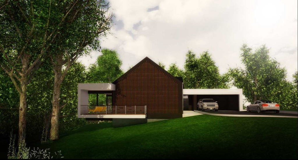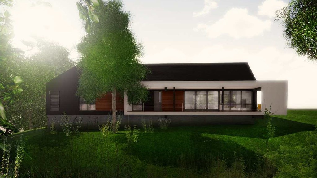 Dom posiada nowoczesną bryłę zewnętrzną z bardzo dużym tarasem od strony lasu.