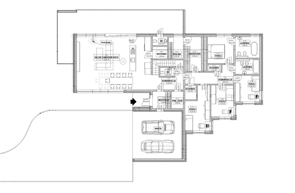 Powierzchnia użytkowa domu to 184,97 m2 (całkowita wraz z piwnicą i poddaszem 421,43 m2) plus garaż dwustanowiskowym w bryle budynku.