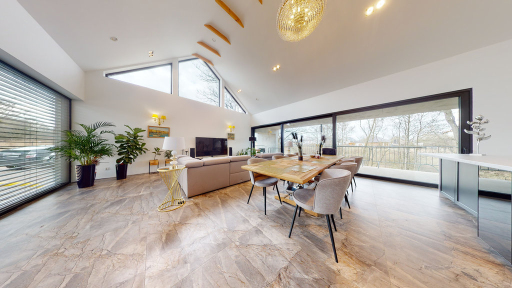 -bardzo przestronny i wysoki salon z jadalnią i aneksem kuchennym (pow. 63,7 9m2) z wyjściem na taras z widokiem na las
