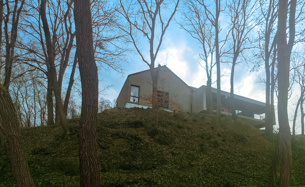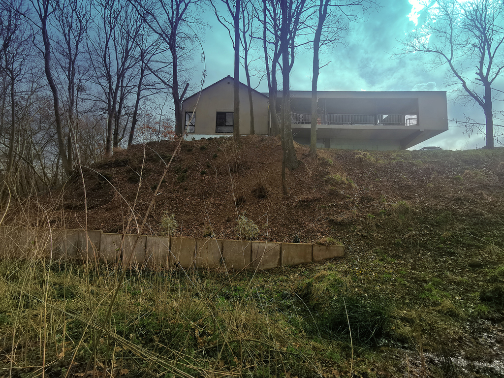 Położony jest na skarpie i otoczony jest własnym lasem, na ogrodzonej działce o pow. 4558 m2 .
