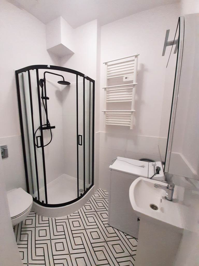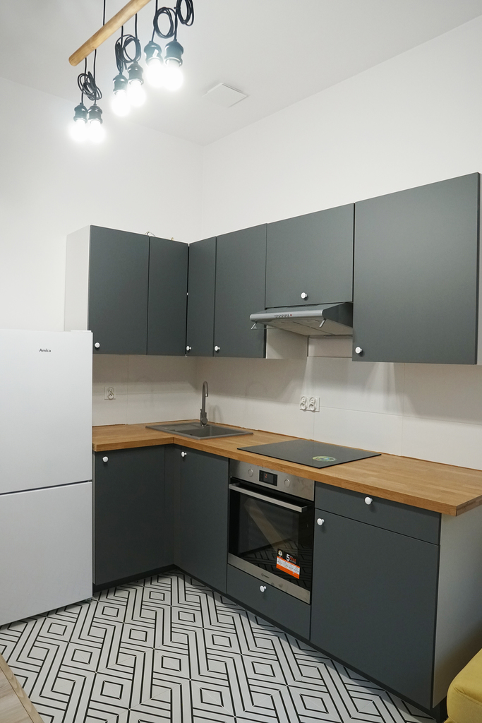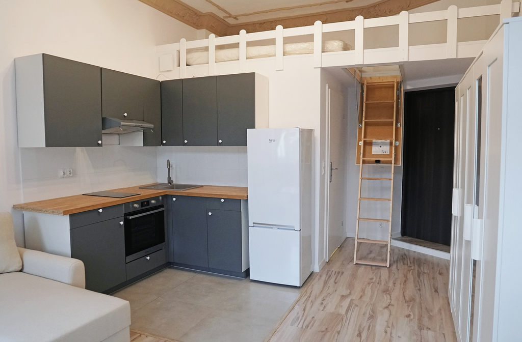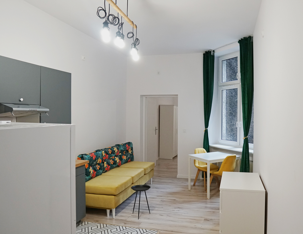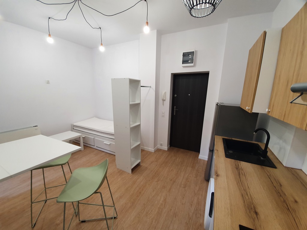 Kawalerka 1 posiada duży jasny pokój z wyjściem na balkon, aneks kuchenny i łazienkę. Dużym atutem jest spora antresola gdzie najemca może spać. Łazienka w nowoczesnej kolorystyce. W pełni umeblowane i wyposażone.