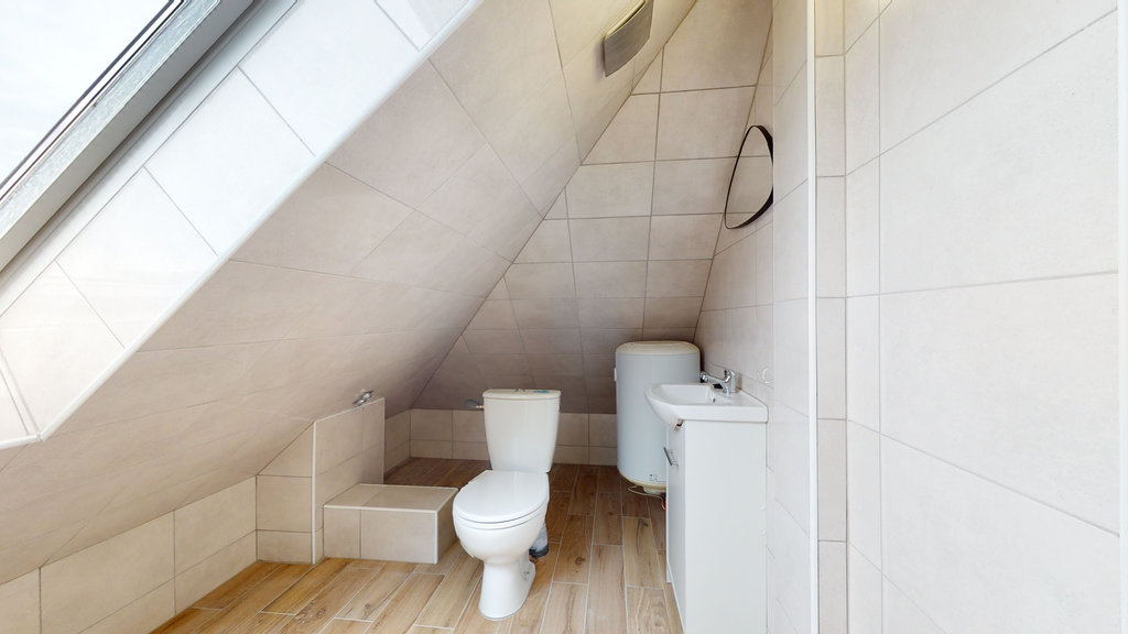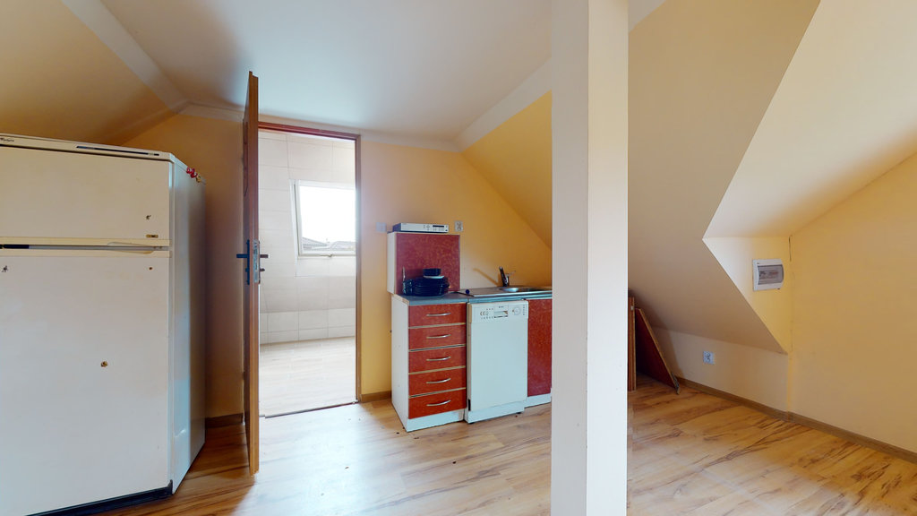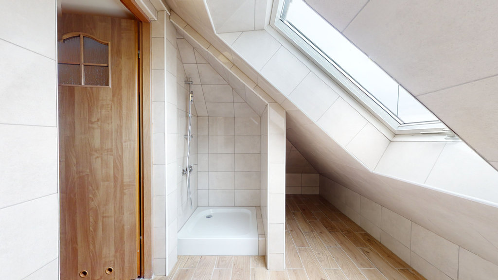 - na poddaszu użytkowym podłogi wykończone panelami , łazienka wykończona glazurą i terakotą, wyposażona w kabinę prysznicową
