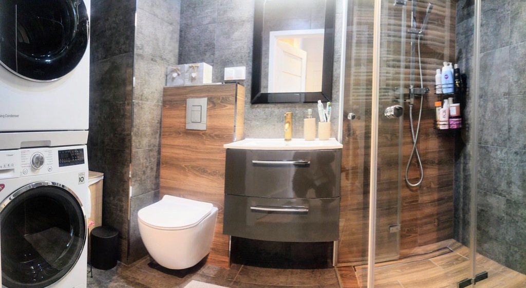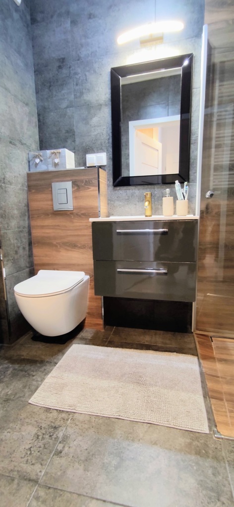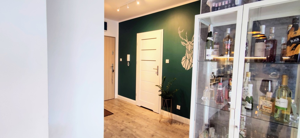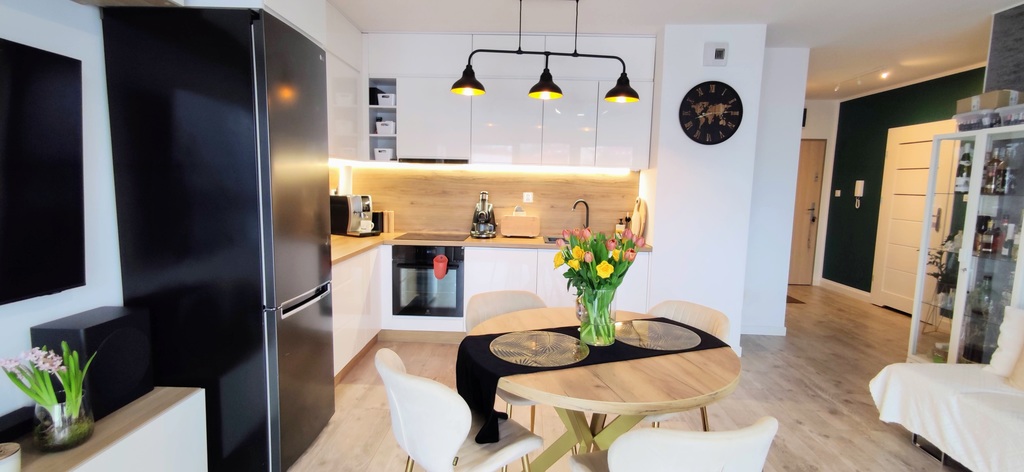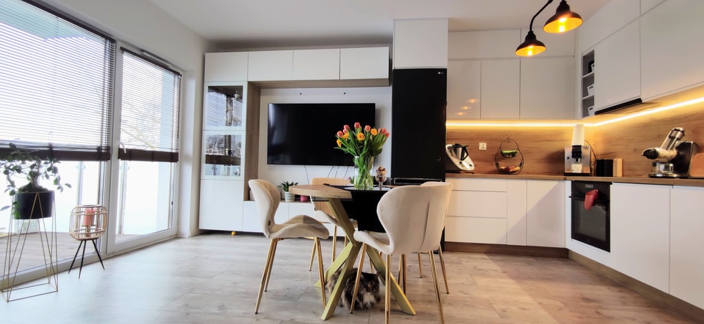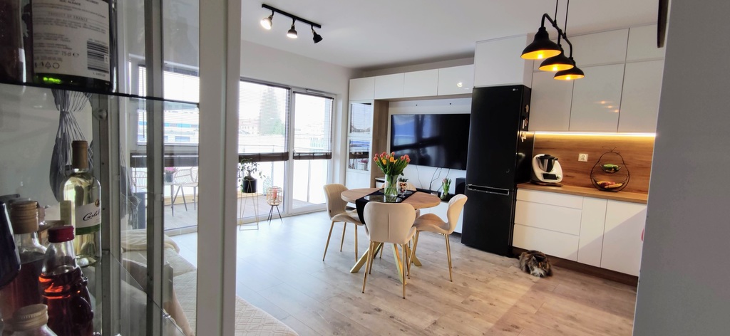 Mieszkanie wykończone pod klucz w wysokim standardzie, z meblami w zabudowie w postaci aneksu kuchennego, szafy w przedpokoju oraz szafki RTV i nadstawki w salonie. Meble w zabudowie kuchennej wyposażone w AGD: lodówka z zamrażarką, zlew, okap, piekarnik, zmywarka.