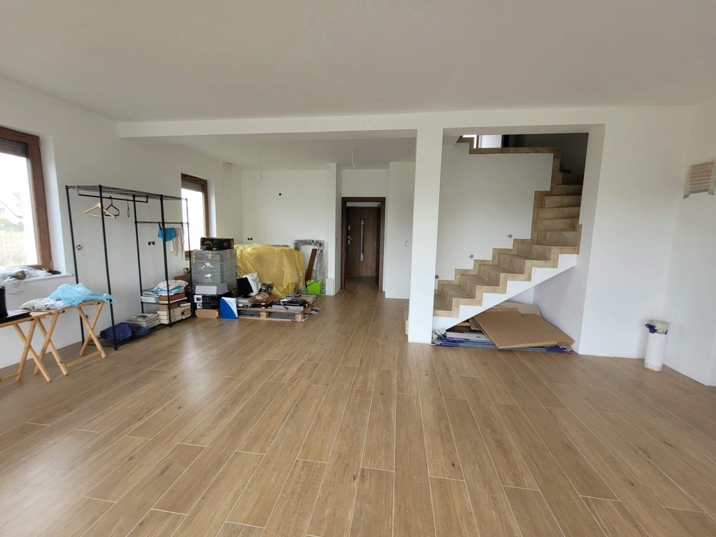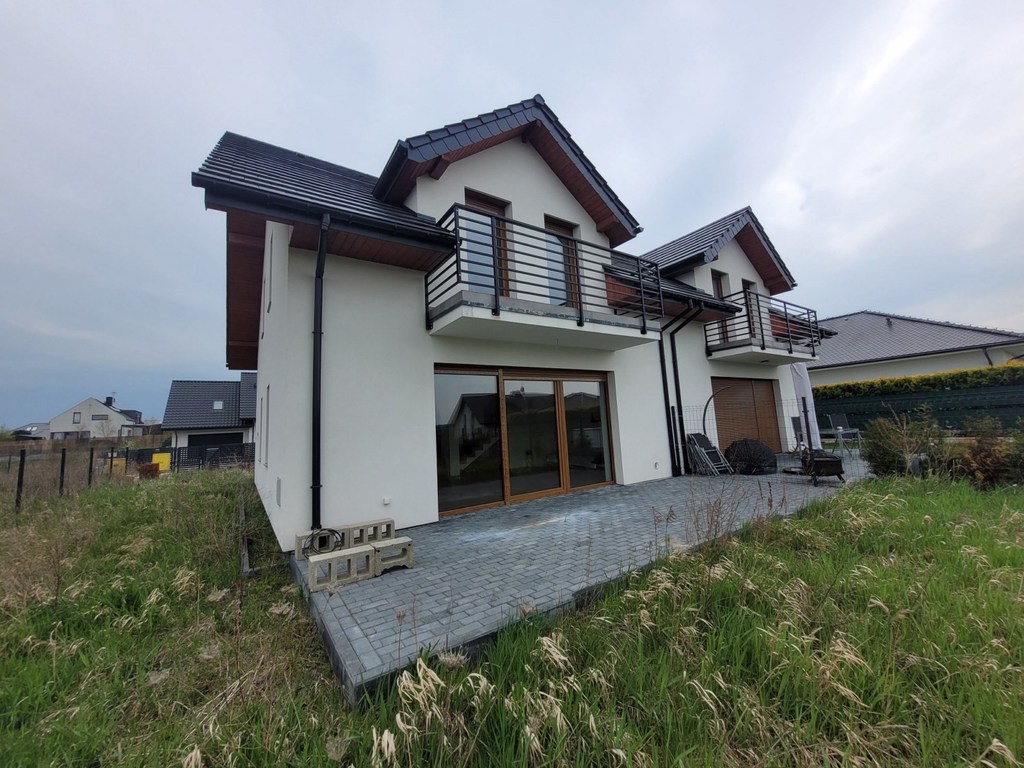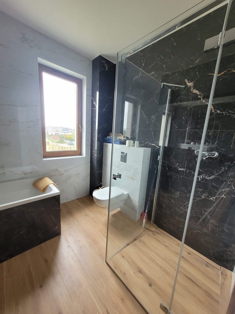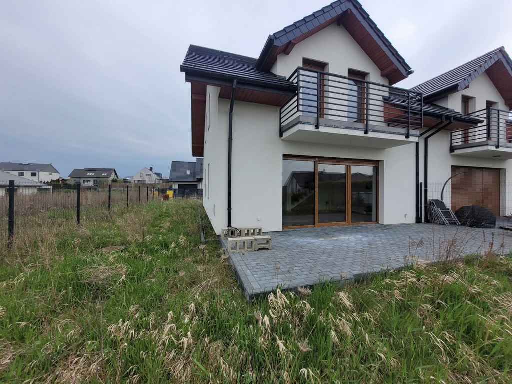 Dobra Szczecińska, boczna ulica od ul. Granicznej. Nowy dom w zabudowie bliźniaczej z 2022 roku na działce 1105 m2, z czego do jednej połowy bliźniaka przynależy udział o powierzchni 552,5 m2. Dom wybudowany z cegły, ocieplony styropianem 20 cm, nowa jasna elewacja. Dach pokryty dachówką ceramiczną. Dom prawie kompletnie wykończony o powierzchni użytkowej 138 m2, całkowitej 188 m2, posiada dwie kondygnacje i strych. Do samodzielnego wykonania przez nowego właściciela pozostała zabudowa i wyposażenie kuchni, zamontowanie kominka oraz kontaktów i klamek w drzwiach wewnętrznych. Na parterze salon połączony z kuchnią o powierzchni 31 m2 /w kuchni jest okno/ oraz łazienka o powierzchni 7 m2 z kabiną, umywalką i wc oraz piecem gazowym dwufunkcyjnym, jak również wiartołap z oknem z miejscem na szafy w zabudowie. W salonie wykonana instalacja kominkowa. Duże przesuwne okno tarasowe. Na piętrze obecnie 2 sypialnie z niewielkimi skosami, ale zgodnie z projektem są trzy sypialnie o powierzchni 18,30, 11,45 i 13,12 m2 /dwie mniejsze sypialnie zostały połączone, co z łatwością da się przerobić niewielkim nakładem/. Obie mniejsze sypialnie z balkonem, przy większej sypialni garderoba z oknem o powierzchni 6, 22 m2. Łazienka wykończona glazurą i terakotą z wanną, kabiną i wc. Dom wykonany z dużą starannością, na parterze na podłogach terakota drewnopodobna, na piętrze panele drewniane. Schody na piętro wylewane, pokryte terakotą. Okna PCV powleczone drewnopodobną okleiną. We wszystkich oknach żaluzje elektrycznie otwierane, alarm rozprowadzony po budynku. Garaż w bryle budynku o powierzchni 18 m2 z bramą elektrycznie otwieraną, wykończony terakotą na podłodze i ścianach do wysokości około 60 cm. Ujęcie wody w garażu, wypuszczone przewody pod oświetlenie zewnętrzne. Wszystkie media łącznie z kanalizacją gminną. Podejście i podjazd do budynku wykonane z polbruku. Dom usytuowany przy ulicy o utwardzonej nawierzchni, ogrodzenie od frontu z deski kompozytowej z bramą otwieraną pilotem. Polecam.