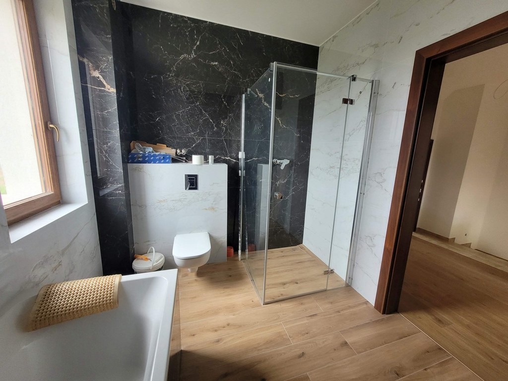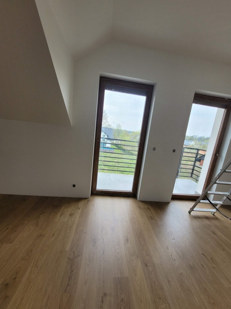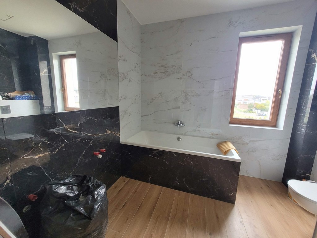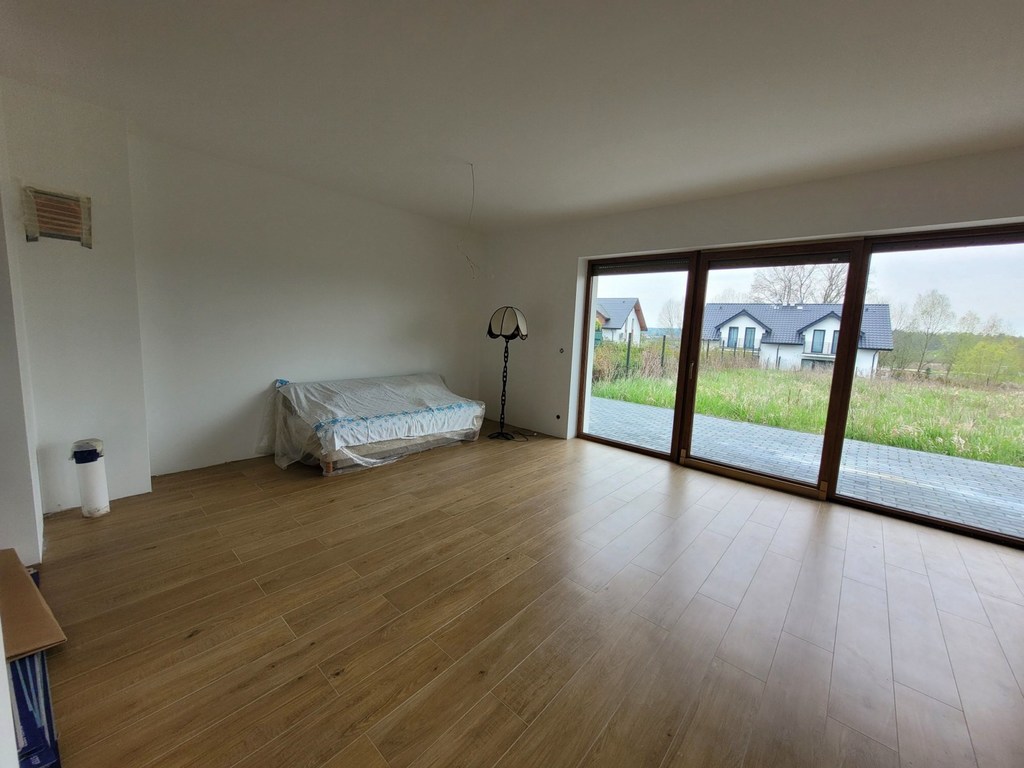 Dobra Szczecińska, boczna ulica od ul. Granicznej. Nowy dom w zabudowie bliźniaczej z 2022 roku na działce 1105 m2, z czego do jednej połowy bliźniaka przynależy udział o powierzchni 552,5 m2. Dom wybudowany z cegły, ocieplony styropianem 20 cm, nowa jasna elewacja. Dach pokryty dachówką ceramiczną. Dom prawie kompletnie wykończony o powierzchni użytkowej 138 m2, całkowitej 188 m2, posiada dwie kondygnacje i strych. Do samodzielnego wykonania przez nowego właściciela pozostała zabudowa i wyposażenie kuchni, zamontowanie kominka oraz kontaktów i klamek w drzwiach wewnętrznych. Na parterze salon połączony z kuchnią o powierzchni 31 m2 /w kuchni jest okno/ oraz łazienka o powierzchni 7 m2 z kabiną, umywalką i wc oraz piecem gazowym dwufunkcyjnym, jak również wiartołap z oknem z miejscem na szafy w zabudowie. W salonie wykonana instalacja kominkowa. Duże przesuwne okno tarasowe. Na piętrze obecnie 2 sypialnie z niewielkimi skosami, ale zgodnie z projektem są trzy sypialnie o powierzchni 18,30, 11,45 i 13,12 m2 /dwie mniejsze sypialnie zostały połączone, co z łatwością da się przerobić niewielkim nakładem/. Obie mniejsze sypialnie z balkonem, przy większej sypialni garderoba z oknem o powierzchni 6, 22 m2. Łazienka wykończona glazurą i terakotą z wanną, kabiną i wc. Dom wykonany z dużą starannością, na parterze na podłogach terakota drewnopodobna, na piętrze panele drewniane. Schody na piętro wylewane, pokryte terakotą. Okna PCV powleczone drewnopodobną okleiną. We wszystkich oknach żaluzje elektrycznie otwierane, alarm rozprowadzony po budynku. Garaż w bryle budynku o powierzchni 18 m2 z bramą elektrycznie otwieraną, wykończony terakotą na podłodze i ścianach do wysokości około 60 cm. Ujęcie wody w garażu, wypuszczone przewody pod oświetlenie zewnętrzne. Wszystkie media łącznie z kanalizacją gminną. Podejście i podjazd do budynku wykonane z polbruku. Dom usytuowany przy ulicy o utwardzonej nawierzchni, ogrodzenie od frontu z deski kompozytowej z bramą otwieraną pilotem. Polecam.