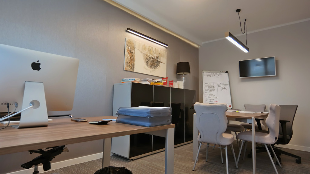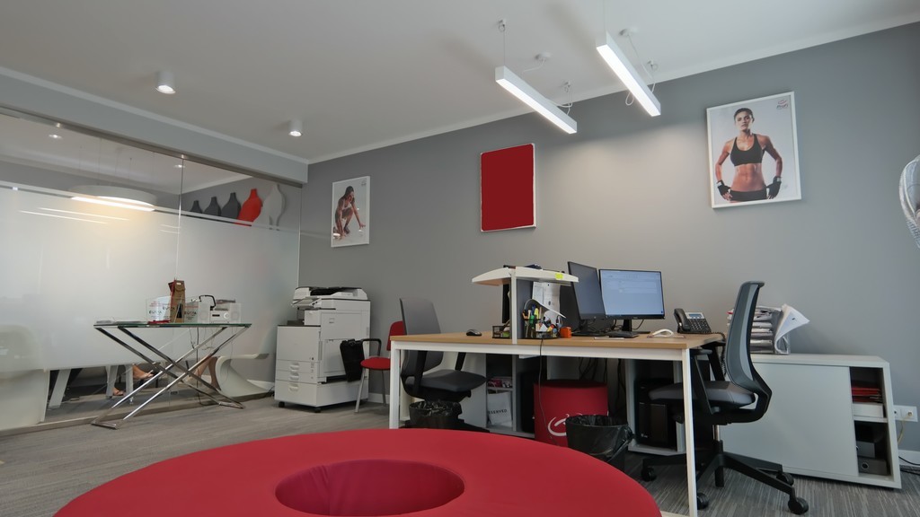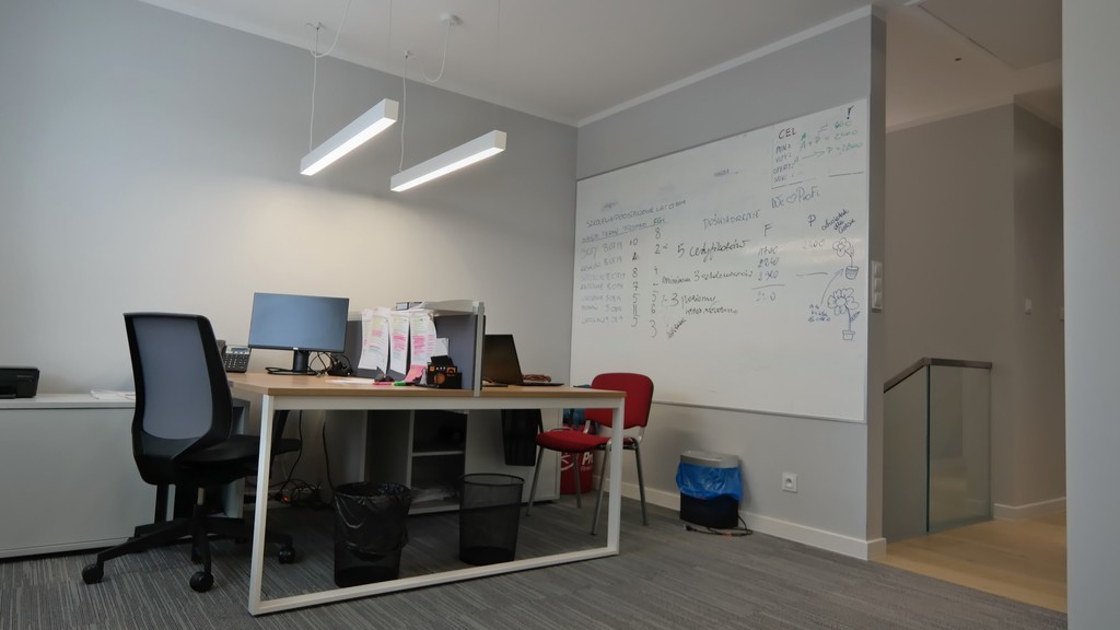 Na poziomie pierwszym jest open space, gabinet, pomieszczenie socjalne. Pomieszczenie socjalne wyposażone w zabudowę robioną na wymiar, wraz ze sprzętem AGD : lodówka, zmywarka, zlewozmywak.