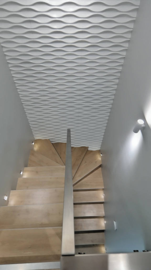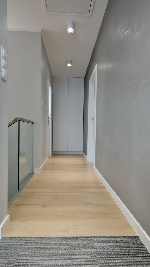 W całej nieruchomości na podłodze położono panele o wysokiej klasie ścieralności w jednym kolorze. Ściany zostały wygładzone pomalowane, na niektórych ścianach nowoczesna, elegancka tapeta. Na jednej ścianie przy schodach położono panel ścienny ozdobny.