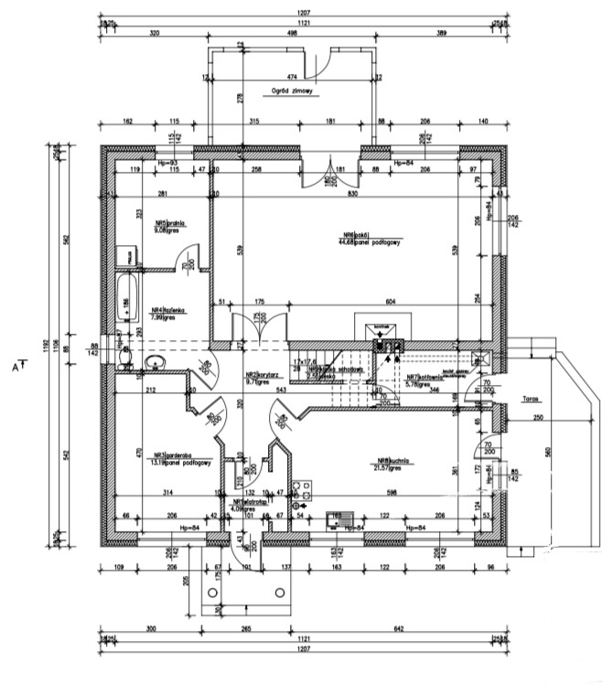 salon 44,68m2 z kominkiem z rozprowadzeniem z wyjściem na zadaszony taras,