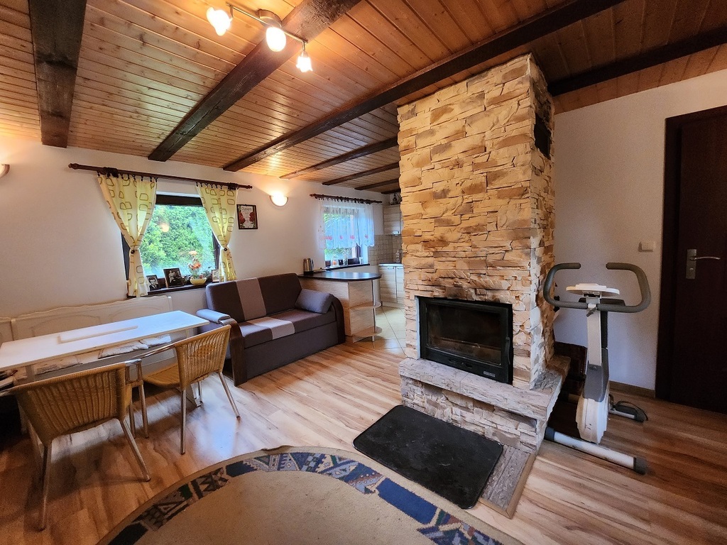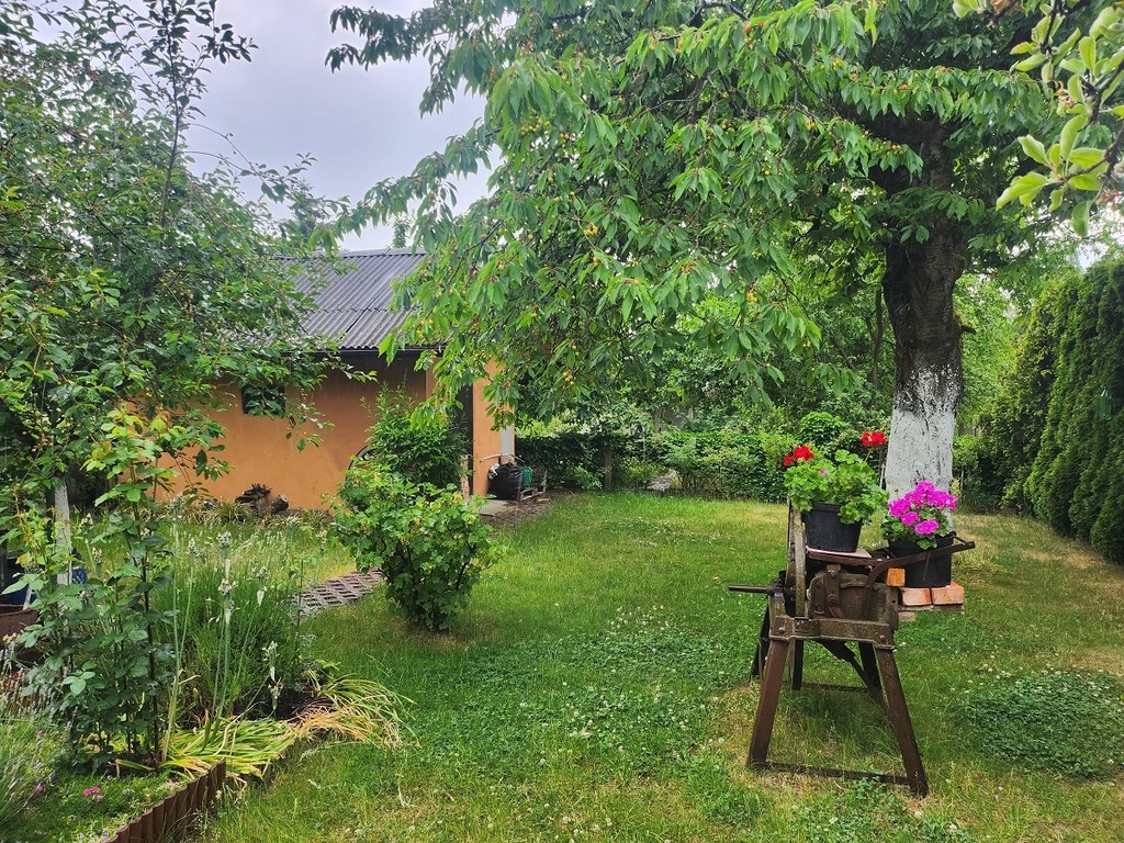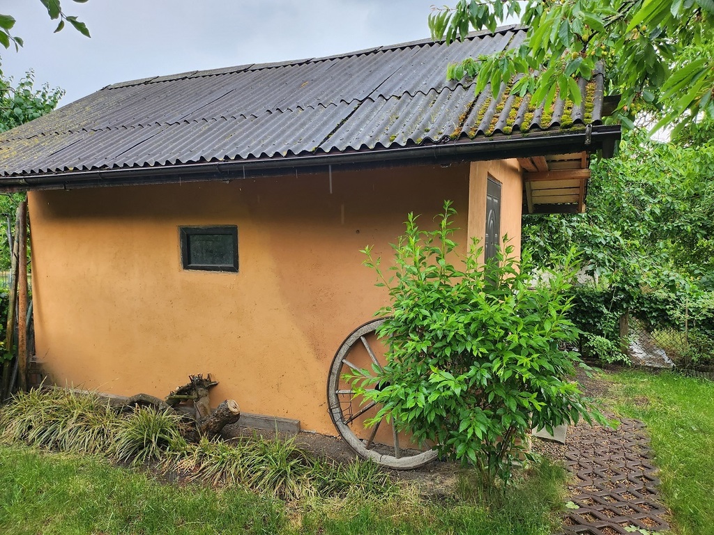Parter pokój, kuchnia, łazienka i zabudowany taras. Pierwsze piętro dwa pokoje i taras. Budynek gospodarczy z cegły. Działka 600 mkw, dzierżawa od R.O.D. "Złota Praha" przy ulicy Bogumińskiej.