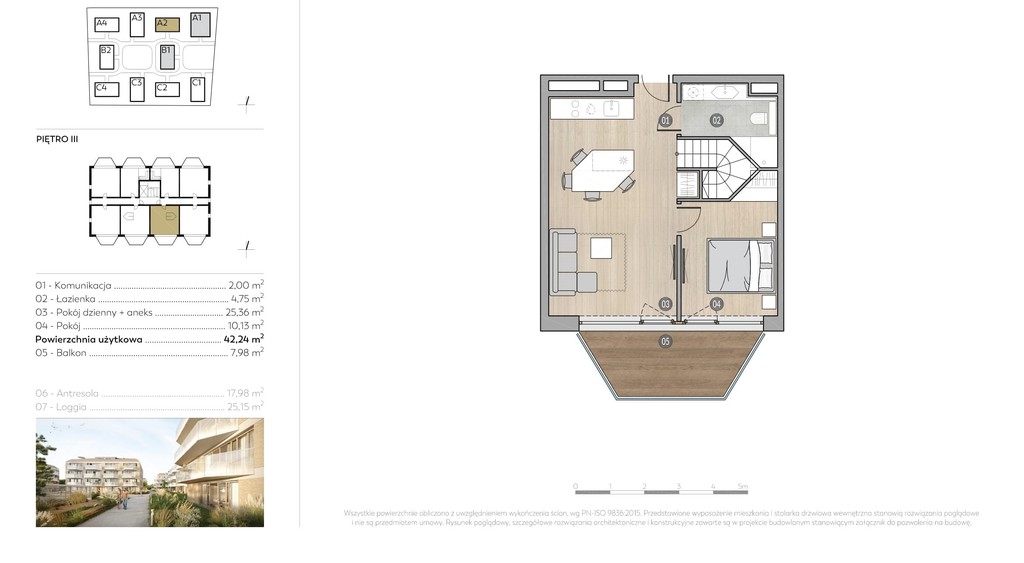- salonu z aneksem kuchennym o pow. 25,36 m2 z wyjściem na balkon 7,98 m2,