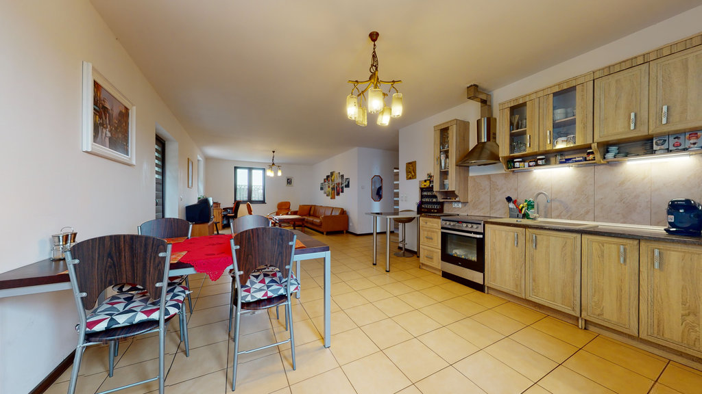 Powierzchnię użytkową domu 162 m2 tworzą obszerny salon wraz z kuchnią i jadalnią 62,50 m2, sypialnia 10,55 m2, gabinet 9,55 m2, cztery pokoje ( 5,50/ 9,18/ 15,20/ 9, 18 m2), dwie łazienki ( 6,53/ 6,1 m2), garderoba, pomieszczenia techniczne oraz komunikacja (foto). Dom ogrzewany jest z pieca termalnego -pompa ciepła, zużycie energii elektrycznej - fotowoltaika.