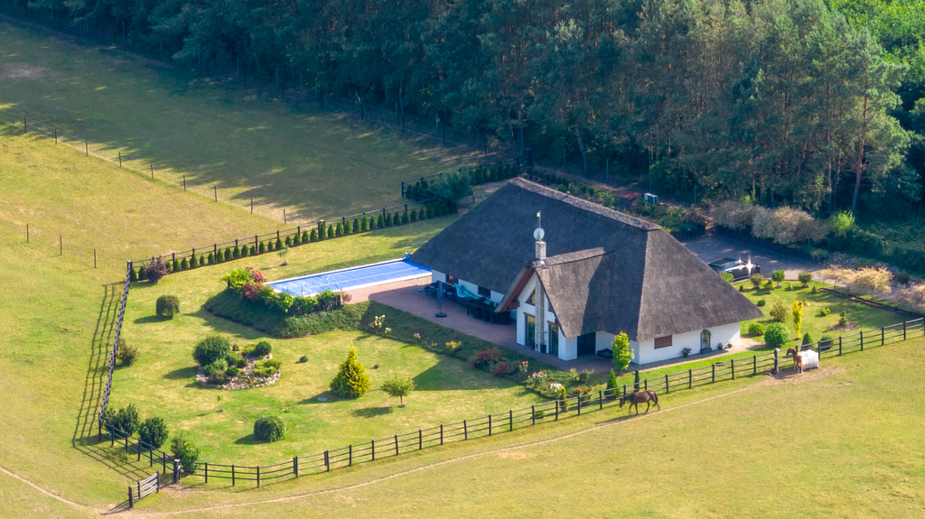 Zbywaną nieruchomość stanowią zabudowane grunty rolne o powierzchni ok. 10, 5 ha :), ogrodzone, podzielone na część mieszkalno rekreacyjną - piękna chata kryta strzechą :)), hodowlaną, 11 padoków - aktuanie hodowla koni Kłusak:))). Rasa jest powszechnie ceniona z uwagi na swoje predyspozycje sportowe oraz niezwykle elegancki i szlachetny wygląd.