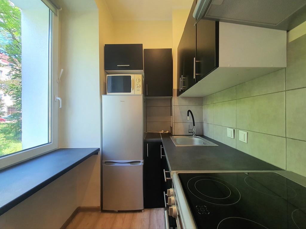 * widna kuchnia 4mkw wyposażona w piekarnik elektryczny i płytę 4-polową, okap, lodówkę i mikrofalówkę;