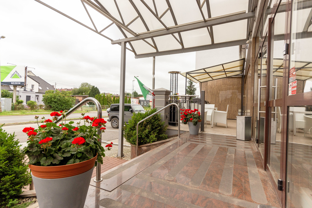 Doskonała lokalizacja: zjazd bezpośrednio z głównej drogi Szczecin – Mierzyn, brukowane podjazdy, monitorowany parking samochodowy.