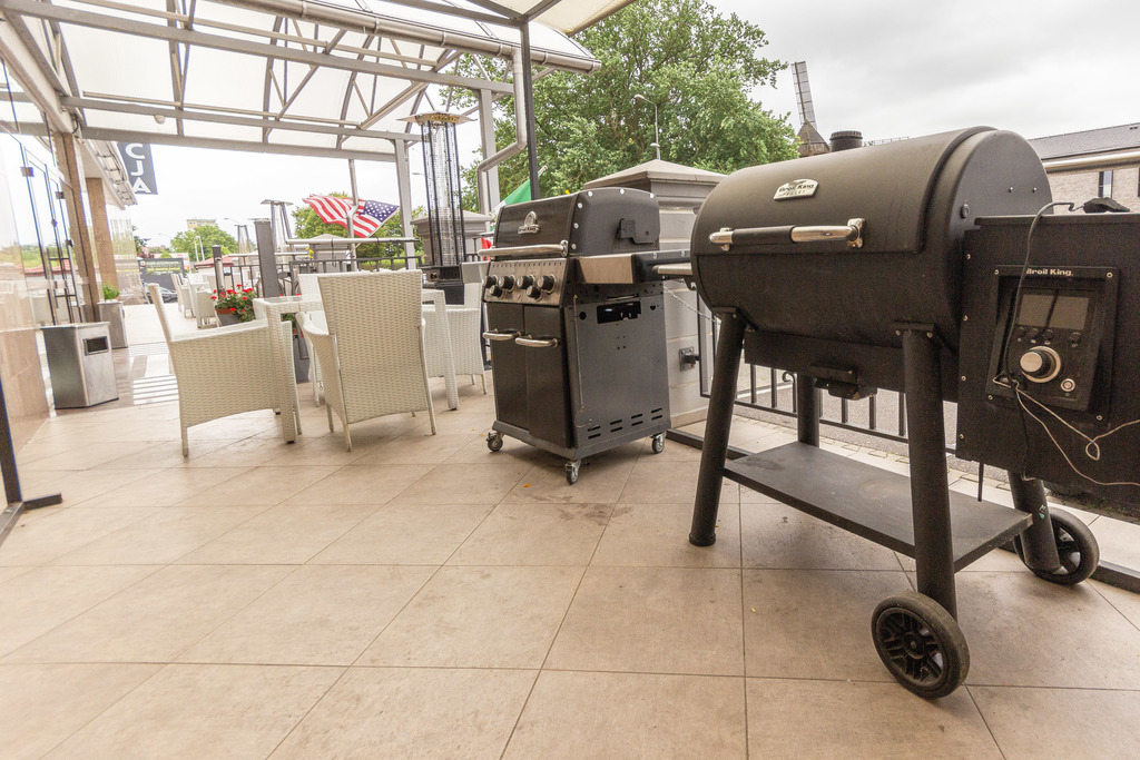 · KUCHNIA - pełne wyposażenie, chłodziarki, lodówki, piece, zmywarki, stoły chłodnicze, szafy mrożące, podstawy chłodnicze, kostkarki, młynki różnego rodzaju, kocioł grzewczy, pakowarka, krajalnica, sokowirówka, klimatyzatory, wentylatory, pochłaniacze itp. Wszystkie urządzenia sprawne, w dobrym stanie technicznym. Wszystkie ściany i podłoga w kuchni obłożone płytkami.